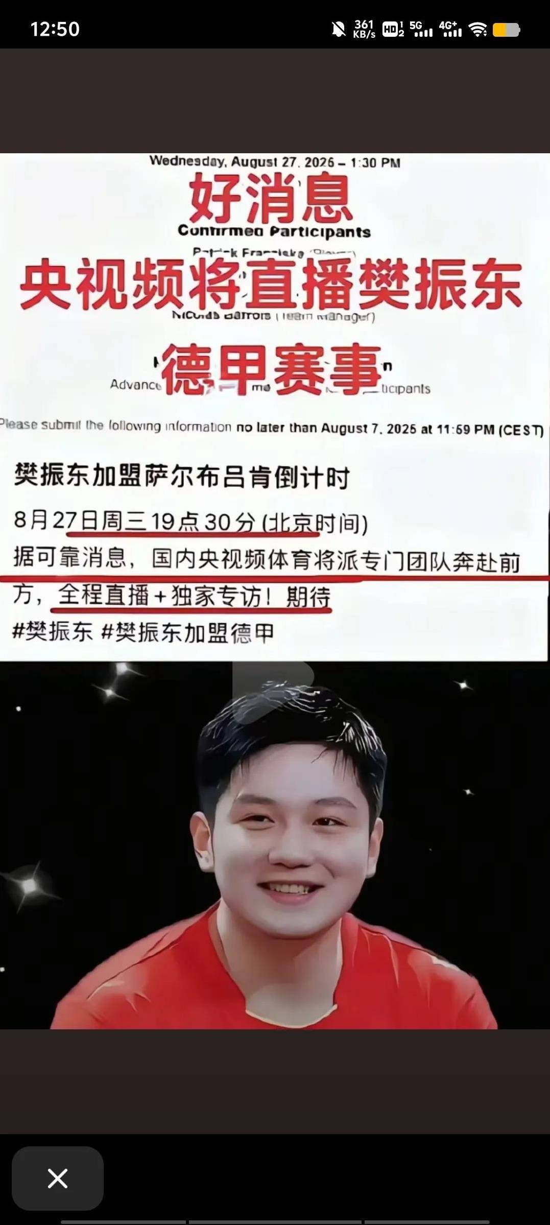 好消息,央视频将直播樊振东德甲赛事[比心],据可靠消息,国内央视频体育将派专门团队奔赴前方,全程直播+独家专访!期待!