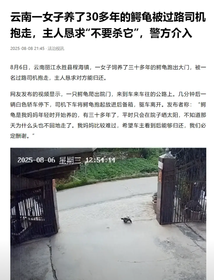 云南丽江,一大妈从程海湖买下一只二十多斤鳄龟,饲养了三十多年,它成了农家乐的“吉祥物”,通人性、不咬人,与主人一家结下深厚情谊。然而,鳄龟近日爬出大门跑到公路上,一辆路过的白色轿车停下后,司机下车,毫不犹豫地将这只三十多斤重的鳄龟抱起,塞进后备箱,扬长而去。大妈一家心急如焚,小女儿含泪上网恳求:“这是我妈妈年轻时就养的伙伴,恳请车主归还,必有重谢!”大妈更是担忧:“不知它活了多少岁数,求求千万别杀它。”家中另一只小龟也因大鳄龟失踪而拒食。无奈之下,大妈已报警。 8月8日,法治视讯报道了一起饲养30多年鳄龟被过路司机抱走失踪的案件,饲养主人求助网络,还报了警,但始终没有结果,这到底是怎么回事呢? 60多岁的杨秀芬(化名)端着食盆走向角落的水池,轻声唤着“阿程”,一只硕大的鳄龟缓缓浮出水面,背甲深褐如历经风霜的古木,足有三十多斤重。 它伸长脖颈,温顺地接受了女主人的投喂。 这只被杨秀芬从程海湖中买下、精心照料了三十余年的鳄龟,早已超越了宠物的定义,成为她生命记忆的温暖注脚。 然而,2025年8月6日这个看似平静的午后,阿程却做了一件三十年来从未做过的事,它缓慢却坚定地爬过院门,踏上了车流穿梭的公路。 同一时刻,一辆白色轿车途经此地,司机陈某(化名)瞥见路中央这么大的鳄龟,毫不犹豫地停车、下车,俯身将阿程抱起塞入后备箱,扬长而去。 这一切,都被农家乐门口的监控镜头完整记录。 当杨秀芬的小女儿发现阿程失踪并调取监控时,失落与焦急笼罩了这个家。 杨秀芬辗转难眠,那只与阿程相伴、体型较小的鳄龟也仿佛感知到变故,连续两日拒食。 女儿将监控视频发布网络,泣声恳求:“它是我妈妈年轻时就开始养的伙伴……恳请那位车主归还,我们必当酬谢!” 杨秀芬面对镜头,话语中满是岁月沉淀的情感:“它被救下时已二十多斤,不知活了多少年岁……求求您,千万别杀它。” 之后,杨秀芬报了警,希望尽快找回鳄龟,但截至目前,陈某与阿程仍不知所踪。 那么,从法律角度,这件事该如何看待呢? 第一,鳄龟阿程属于杨秀芬所有,依法受到保护。陈某未经允许擅自将鳄龟带走,已涉嫌侵犯他人财产权。 《民法典》第二百二十四条规定,动产物权的设立和转让,自交付时发生效力,但是法律另有规定的除外。 杨秀芬陈述,其在30年前看到有人捞上了鳄龟阿程,本来要杀掉,于心不忍,遂买了下来。 如杨秀芬所述属实,则其与鳄龟的卖家双方达成买卖合同,一手交钱,一手交货,杨秀芬已取得鳄龟的所有权。 《民法典》第二百六十七条规定,私人的合法财产受法律保护,禁止任何组织或者个人侵占、哄抢、破坏。 杨秀芬作为鳄龟的权属人,有权对其进行占有、使用等处置行为,合法权益受法律保护,而陈某未经权属人同意,擅自抱走鳄龟,侵害了杨秀芬的物权。 第二,若陈某系主观故意且拒不归还,则可能构成盗窃罪或侵占罪。 《刑法》第264条规定,盗窃公私财物,数额较大的,或者多次盗窃、入户盗窃、携带凶器盗窃、扒窃的,处三年以下有期徒刑、拘役或者管制,并处或者单处罚金。 陈某抱走鳄龟的地方虽然是道路上,但旁边就是农家乐,应该能预见到这么大一只鳄龟应该是附近人家的,如其在明知的情况下,仍然趁人不注意直接抱走,则其行为符合盗窃特征。 一旦鳄龟鉴定后市场价格达到2000元以上,陈某则或构成盗窃罪,将被追究刑事责任。 但是,陈某也可以抗辩,其系误认鳄龟为无主物或走失动物,遂抱走,而事发时,杨秀芬对爬至公路的鳄龟丧失实际管领力,此时鳄龟处于脱离占有状态,陈某获取鳄龟时未侵入杨秀芬的物理控制领域,不属于侵犯他人占有状态。 基于此,从有利于被告人原则,陈某亦可能排除盗窃罪追责。 不过,陈某在拾得鳄龟后,对龟形成事实占有,按照《民法典》第314条的规定,其有义务履行寻找权利人,并积极返还。 如其在知情后,将鳄龟隐匿,符合 “拒不归还” 要件。 《刑法》第270条规定,将代为保管的他人财物非法占为己有,数额较大,拒不退还的,处二年以下有期徒刑、拘役或者罚金。 在云南地区,侵占罪中“数额较大”的标准为非法侵占他人财物8000元以上。 一旦查实鳄龟价值超出这个标准,陈某拒不返还的行为将构成侵占罪,依法可以追责。 即便陈某的行为不构成刑事犯罪,但如有恶意侵占故意,则其行为属于治安违法,依法可以处以拘留及罚款处罚。 第三,此外,在民事责任层面,杨秀芬有权要求陈某返还遗失物,并向其主张因故意或重大过失造成的损失的赔偿责任。 考虑到鳄龟具有特殊情感价值,其行为还可能对杨秀芬造成精神损害,理论上可主张相应赔偿。 对此,大家怎么看呢?