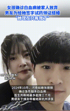 “万年一遇的好男人!”8月7日报道浙江杭州,一女子检查患上了白血病,没想到家人得知后,给了6000元后就不再接电话!就在女子绝望之际,男友却不离不弃,甚至为了能让女友能用上新药,坚持和她领证结婚!在接受采访时,男友的话让人泪目!网友:这才是爱情原本的样子!