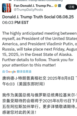突发消息:特朗普今天(北京时间8月9日)写道:“我作为美利坚合众国总统与俄罗斯总统弗拉基米尔·普京之间备受期待的会晤将于2025年8月15日星期五在伟大的阿拉斯加州举行。更多详情敬请期待。感谢您对此事的关注!”