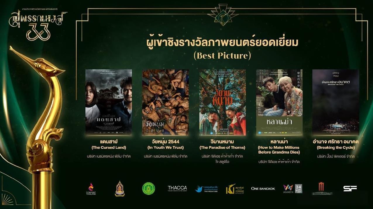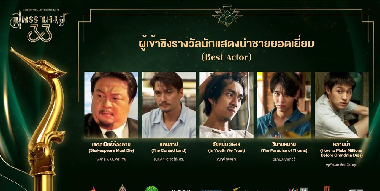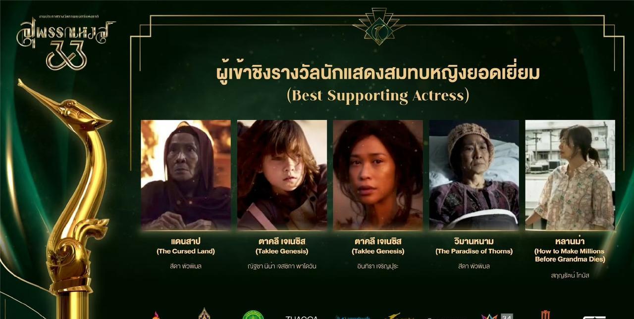 #泰国娱乐# 第33届泰国电影金天鹅奖公布入围名单。。《The Cursed Land》、《荆棘天堂》、《姥姥的外孙》等电影入围了最佳影片奖,Ananda、Jeff、Billkin等入围了最佳男主角奖,Yaya、Engfa、Taew、Bow等入围了最佳女主角奖。。期待颁奖典礼。。