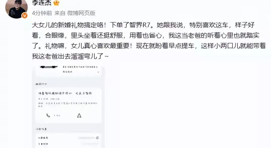 8月8日,是个好日子,功夫明星李连杰官宣大女儿结婚好消息,李连杰发文自己给大女儿的新婚礼物是智界R7,大女儿也喜欢这款车,看来,李连杰也快升级为功夫老丈人了![比心][比心][呲牙]