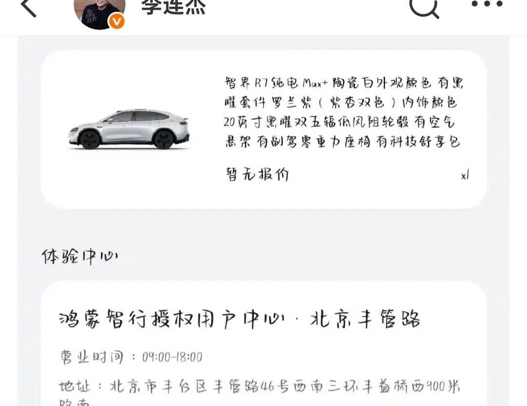 谁说华为不会营销的,智界汽车这次请了李连杰:李连杰竟然给家人定了一台新款智界R7…… 虽然很多演员、明星、知名人士都喜欢鸿蒙智行的车,特别是问界M9,但是感觉这次应该是个广告,和刘亦菲代言智界不一样,这个就是帮忙推荐一下。