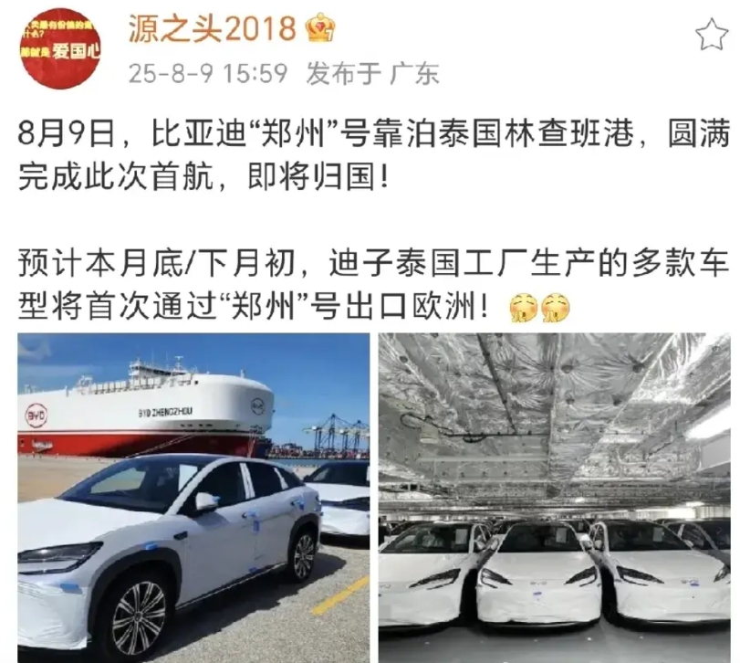 比亚迪泰国工厂的产品要出口欧洲了。 想来大体是因为欧洲那边没有对泰国或者东盟加汽