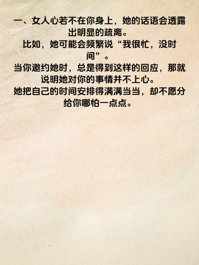 一、女人心若不在你身上,她的话语会透露出明显的疏离。比如,她可能会频繁说“我很忙,没时间”。当你邀约她时,总是得到这样的回应,那就说明她对你的事情并不上心。她把自己的时间安排得满满当当,却不愿分给你哪怕一点点。 二、“我们不合适”这句话一旦频繁出现,也很能说明问题。她不再愿意和你深入交流彼此契合的地方,而是直接否定你们的关系。这表明她从内心深处觉得你们之间没有未来,心已经开始远离你。 三、还有“你别管我了”这样的话。她开始抗拒你对她生活的关心,想要自己独立的空间,并且不想让你参与其中。这意味着她在情感上已经把你划出了自己的圈子,心不在你这儿了。遇到这些情况,男生要及时察觉,审视你们的关系,做出合适的调整。