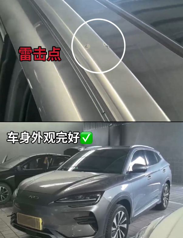 8月5日广西北海铁山港服务区真的上演了惊险一幕!一辆比亚迪宋PLUS EV在雷暴天里,居然被闪电连续击中车顶3次!强电流在车顶留下了明显的放电痕迹,想想都觉得后怕