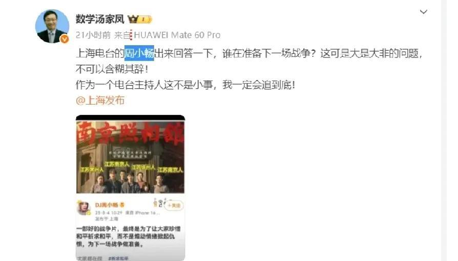 终于有人站出来怼上海电台主持人周小畅了! 一部爱国题材电影《南京照相馆》让上海电台主持人周小畅破防了。 周小畅说:这部电影煽动情绪煽动仇恨,为下一场战争做准备。 考研圈“纪委”汤家凤站出来了,他回怼周小畅说道:“上海电台的周小畅出来回答一下,谁在准备下一场战争?准备的上一场战争又是哪场战争?这可是大是大非的问题,不可以含糊其辞!作为一个电台主持人这不是小事,我一定会追到底!” 网络大V卢克文也站出来了,虽然没有指名道姓。但是他说道:为什么杀人放火奸淫掳掠的日本人从来不反省,我们拍个电影,就叫我们反省? 也许周小畅精神上是个日本人。她多多少少是个公众人物,粉丝100多万,也很多了。《南京照相馆》竟然让她公开破防,看来她不允许有人说日本的的不好。 法国人向中国捐献了日本侵略中国时的罪行照片,我们借此也拍成了电影,正好在抗日战争胜利80周年前上映。其实,已经很合理了。 周小畅,你到底是怎么了?为什么说出为下一场战争做准备这种话!!!