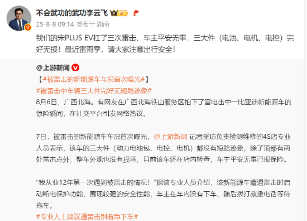 事情的起因是广西北海铁山港服务区内,一辆宋PLUS EV在缓慢行驶时,突然被雷电连续三次击中,现场顿时火花四溅,看上去十分恐怖。但车内人员却毫发无损,并且车子也没有受到什么损伤,此后将车子送到4S店进行检修后,这位车主还继续完成了广西的旅游行程。