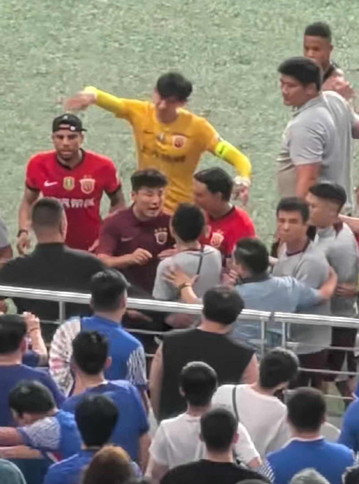 前因后果不讲全?这是客队球迷区,有个海港球迷和茹萨要球衣,茹萨脱下来,递过去被申花保安挡,这时候来了几个申花球迷,在保安的护送下,把那个海港球迷推开,4 5个保安,不但不保护海港球迷,还不理会茹萨,然后张琳芃和武磊正好路过,对保安说着什么,保安无作为,海港几个球员担心球迷安慰,全程关注看台申花那几个球迷和保安