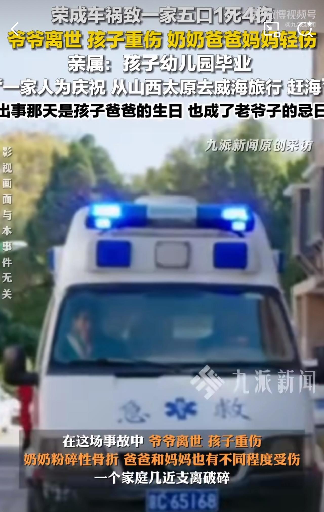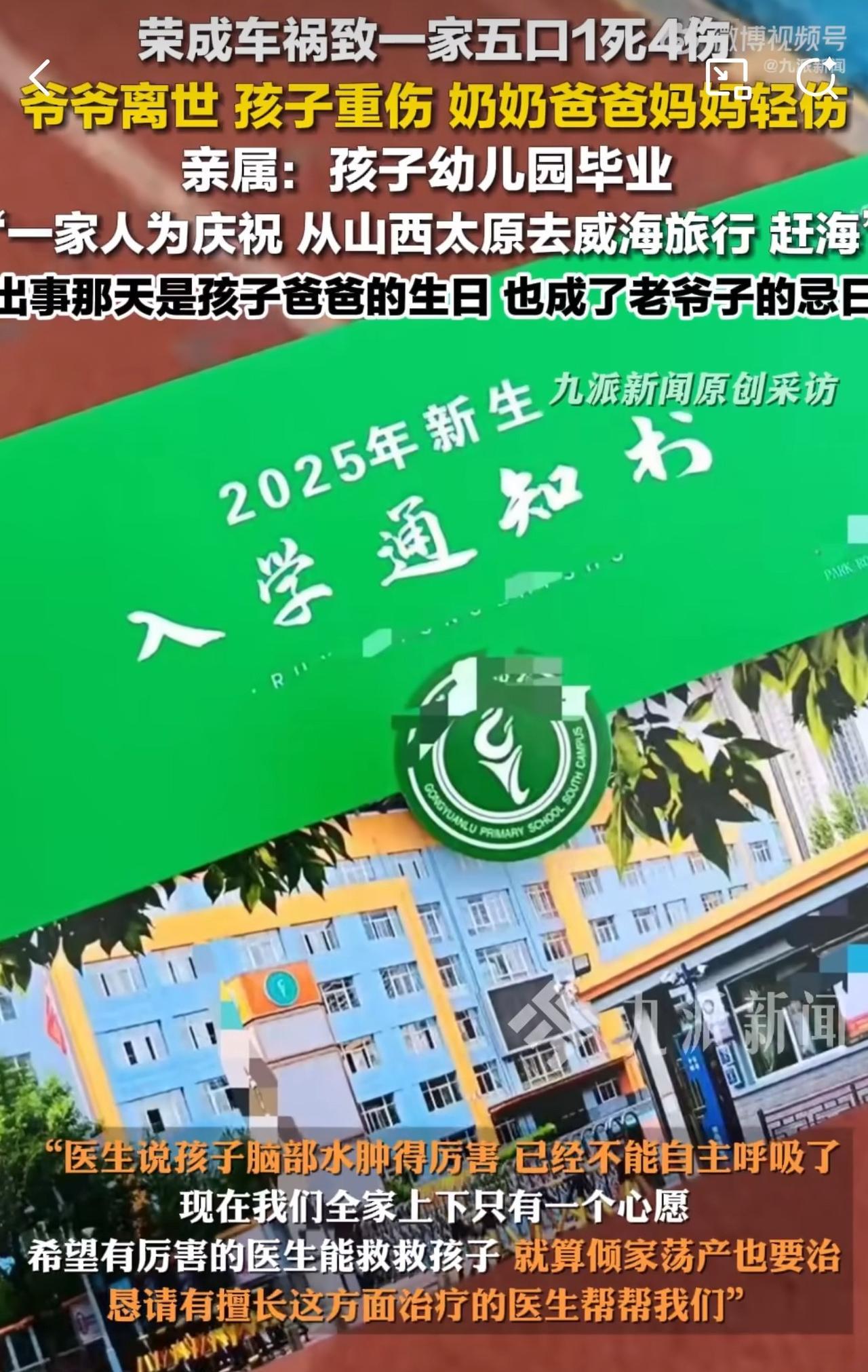 #MCN双量进阶计划#痛心!一张小学录取通知书还没焐热,一场车祸就让五口之家天人永隔。 据媒体报道,8月5日,山西一家人赴威海旅行,第二天便遭遇不幸:封闭小区内的车辆撞人事故,导致爷爷当场身亡,4岁的钰儿重伤进ICU,父母和奶奶1死4伤。 据悉,这本是充满期待的旅程:为圆钰儿赶海梦,恰逢妹夫生日,姥姥刚从太原取来她的小学录取通知书。可如今,母亲术后麻药未醒就嘶吼着问“孩子是不是没了”,家属不敢告知实情。医生曾说,母亲术前就放话“孩子没了自己也不活了”。 而家属坦言,“急盼擅长相关治疗的医生援手,只要钰儿活下来,倾家荡产也治。” 看完这事儿,周少想说真让人痛心。一家五口高高兴兴去旅游,就为了圆孩子一个赶海的心愿,结果遇上这种事,爷爷没了,小钰儿还在ICU里躺着,好好的家一下子就塌了大半。 最让人揪心的是那封小学录取通知书,刚拿到手,还没来得及跟孩子好好庆祝,就被一场车祸搅得支离破碎。孩子妈麻药还没过就惦记着孩子,说孩子没了自己也不活了,这得多绝望啊。 封闭小区里开车,按理说该慢点儿再慢点儿,怎么就出这么大的事?现在只希望有厉害的医生能看到消息,帮帮这孩子,她要是能挺过来,这个家才有重建的可能。 对于这起事故,大家怎么看呢?#长沙新朋友# #寻美三湘#