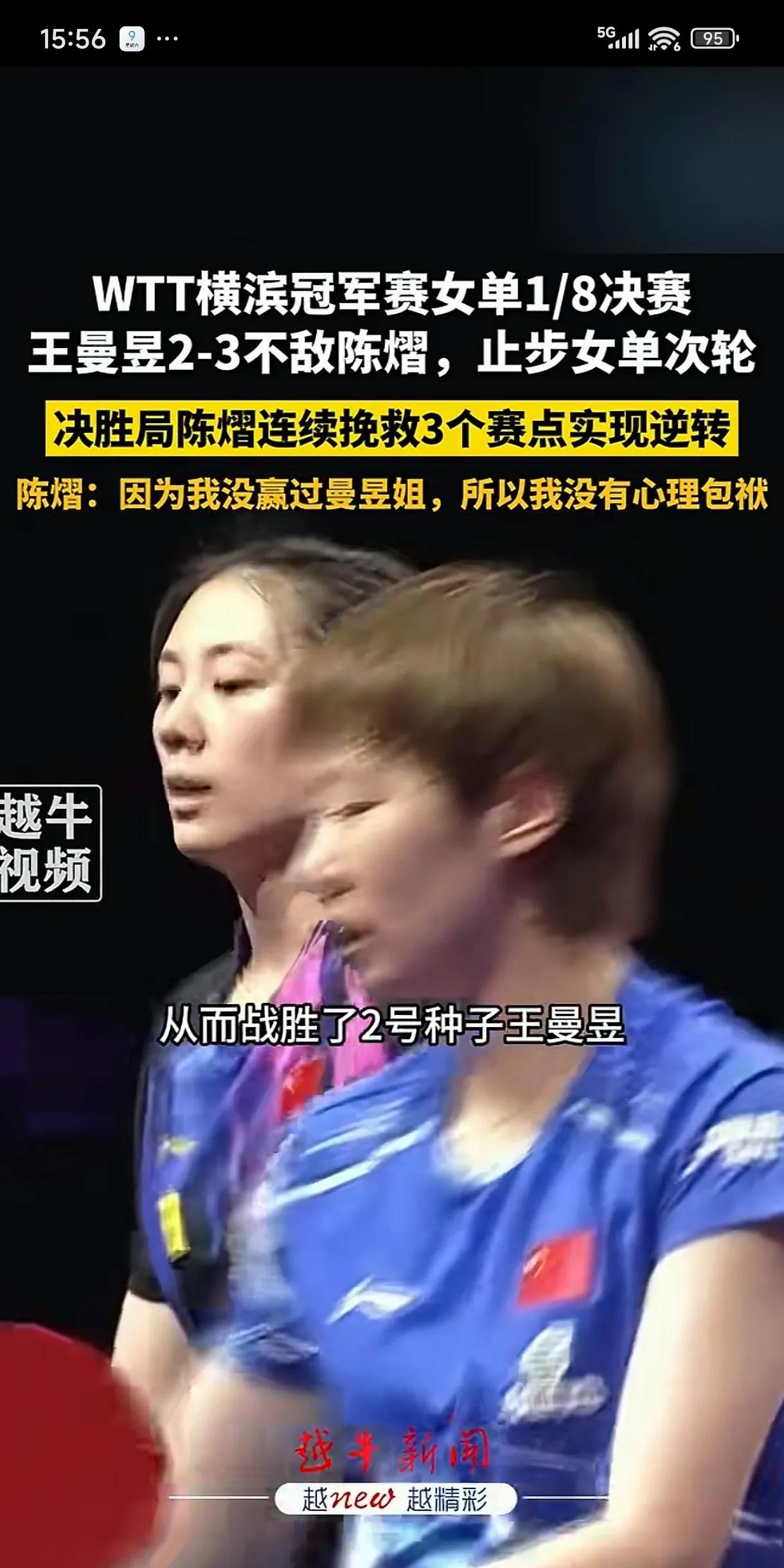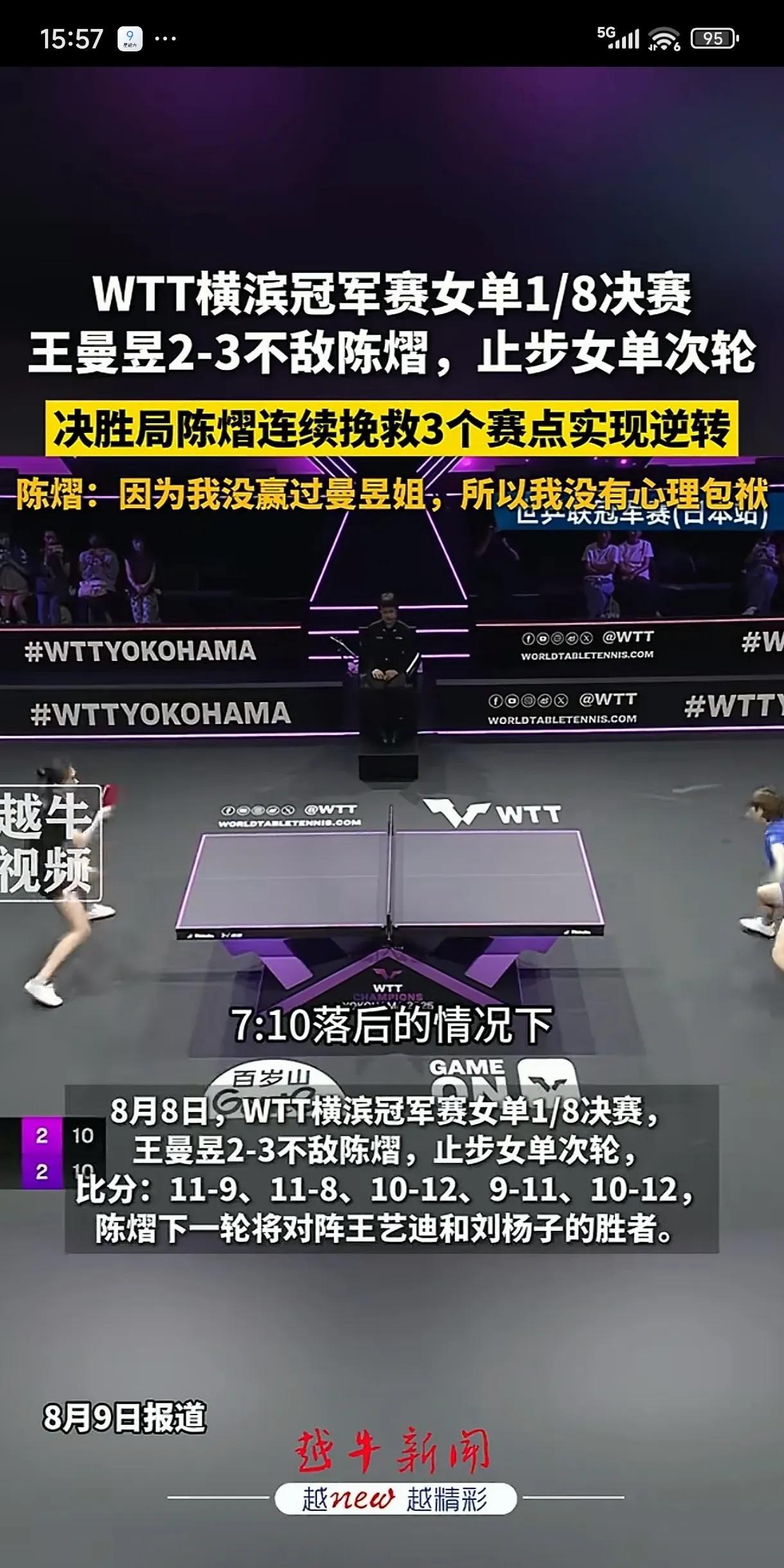 国乒后继有人! 陈熠最近几个月的状态真的太炸裂了!先后战胜了多名世界顶尖选手,战胜孙颖莎的那次,在大比分2:1领先时,状态好到让前世界冠军郭焱在直播中说出了:“陈熠要懂点事,差不多得了”的这句话,一时引起很大的风波,最后郭焱不得不道歉,如果很多人认为这场球她是蒙的,可是后来她又战胜了蒯曼,接着又战胜了早田希娜,如果这些都不能说明她的成长,那就请看看今天日本横滨大满贯赛对阵王曼昱的比赛吧,比赛一上来,王曼昱就连下两局,把陈熠逼入绝境,可是她并没有慌乱,通过调整连扳两局,把比赛拖入决胜局,在决胜局形式对她极其不利,王曼昱强势10:7拿到赛点,但是她并没有缴械投降,而是展开强势反击,连拿5分,一举逆转了比赛,最终带走胜利,足以说明她的成长和优秀,她的出现让女乒2028的竞争已经白热化,陈熠具有优秀运动员意志品质,前途不可限量,看好她,加油!