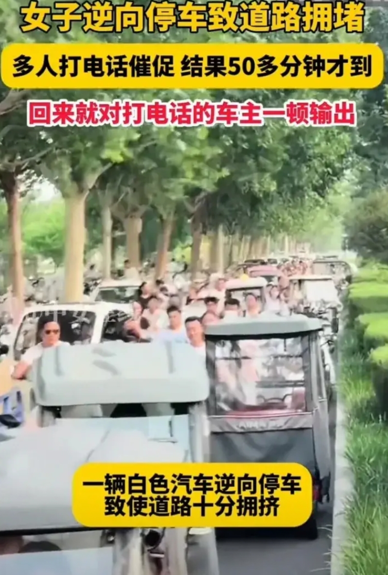 看看这嚣张的女子,为了接孩子逆行停车50几分钟,堵住很多车辆无法通行,还怪别人打