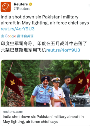 路透社:印度空军司令8月9日表示,印度在5月份击落了六架巴基斯坦军机。 评几句:当初,巴基斯坦军方迅速亮出证据,法国达索公司也证实其制造的阵风战机被击落,印度空军司令此番言论瞬间沦为笑谈。莫迪在开战前力排众议,将空军司令提拔为印军总参谋长,此前从未有空军将领获此要职。开战后印度空军猛冲在前,自恃对巴基斯坦空军优势大,欲借此稳固莫迪在军中的布局。谁料战况急转直下,印度空军劣势尽显,被打得落花流水,莫迪在军中的地位也随之产生动摇。如今8月已至,印度空军司令难道又想靠“嘴炮”找补,这等操作实在难以让人信服。