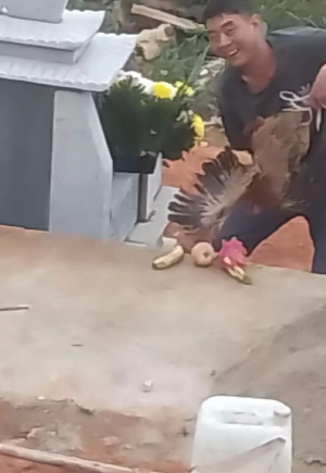 男子悄悄的跟踪灰衣男子,发现灰衣男子走到另一边墓地里,跟另外两名男子交流着,并且炫耀自己捡到了一只鸡。这名男子这才知道,原来前来墓园偷祭品的,一共有三个人。