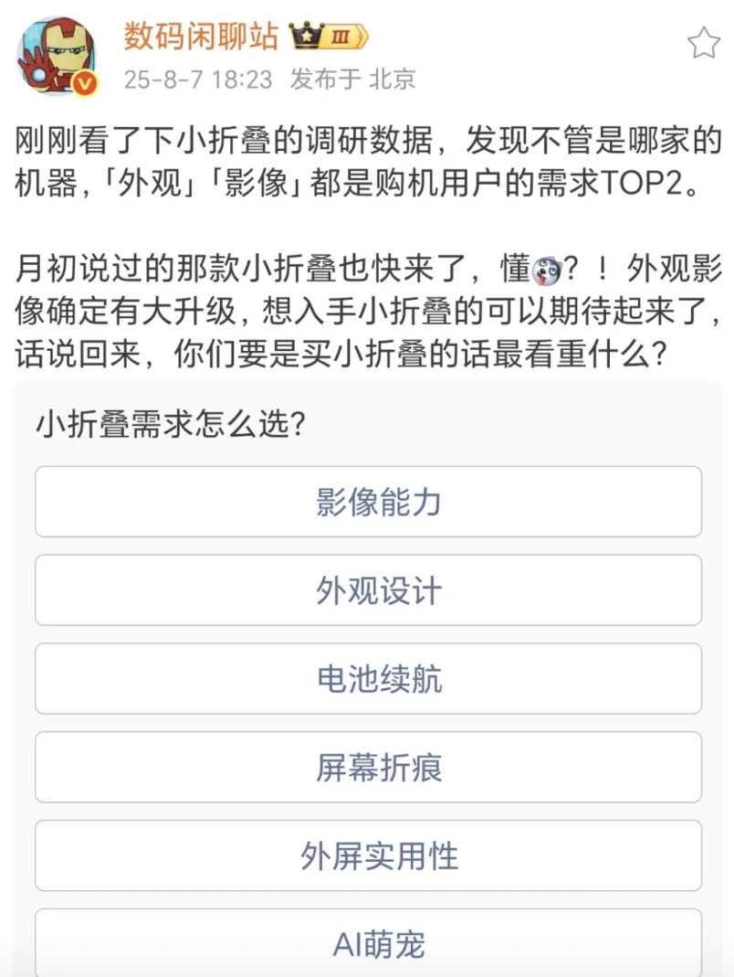 在折叠屏这一块,你可以永远相信荣耀。 荣耀Magic V Flip2基本确定在8月跟大家见面了,关于续航这点大家可以放心,每一代荣耀折叠新品,都会刷新行业轻薄记录。荣耀的青海湖电池硅含量一直显著高于行业平均水平,电池上到5500mAh以上一点也不奇怪。 至于关同学提到的“两个小目标”,很有可能是2亿像素主摄,影像一向是小折叠的通病,这次曝荣耀将发布行业首款2亿像素小折叠,带来极致的影像体验。
