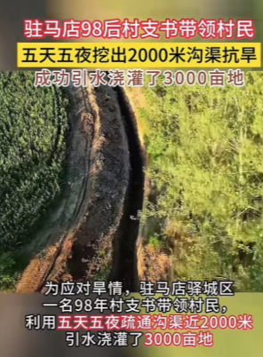 “这个村支书胆子太大了!”河南驻马店,98后村支书带领村民五天五夜挖出2000米沟渠抗旱,成功引水浇灌了3000亩地!网友:事实证明,基层干部真正为民着想,只要想干就没有干不成的事!