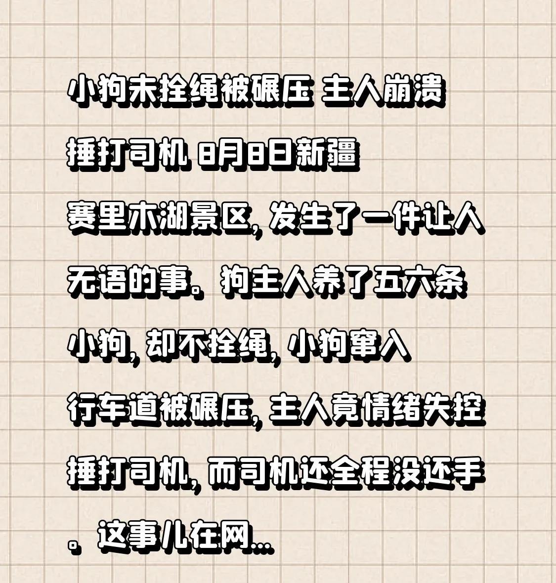 小狗未拴绳被碾压主人崩溃捶打司机8月8日,在新疆赛里木湖景区,有一件事让人颇
