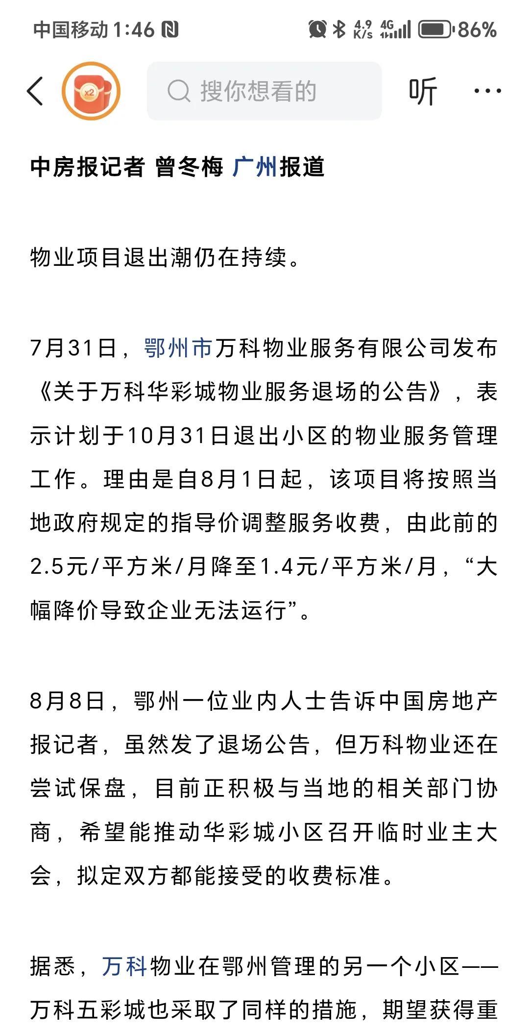 物业费下调近四成,物业公司发出退场公告。 湖北省鄂州市,有关部门制定了物业费的收费标准,要求物业公司调整,要从原来的2.5元每平米降低到1.4元每平米,物业公司不愿意了,威胁要退场,要与业委会以及有关部门协商,达不到效果就跑路。 现在的物业费确实太高,动辄三块多四块多,居民的压力太大了。 #物业费收费规则# #物业收费# #物业费新政# #物业费定价# #物业费收费率# #预收物业费# #物业费时效# #物业费降低# #物业# #取消物业实行居民自治,你同意吗# #取消物业,你同意吗?#