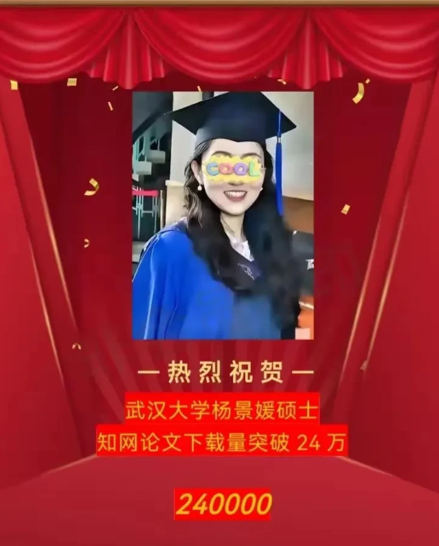 破纪录了,杨景媛的硕士论文,知网下载量突破了24万,不得不说,这是一个很大的突破,很多人的论文下载量多的话是一种自豪,然而杨景媛的下载量这么大,或许她的脸庞会一阵阵发热。 杨景媛的事情或许要告一段落,然而留给肖同学的伤害却无法弥补,他的身心健康已经收到极大的伤害,本来是以660分考入的武汉大学,却被400分交流学习进入武汉大学的杨景媛诬陷诽谤,虽然法院也给予了公正的判决,但是对于肖同学的处分依然没有撤销,而杨景媛还洋洋得意的在网络炫耀,还要把肖同学举报到所选择录取的学校,实在是嚣张至极,丧心病狂。 群众的眼睛是雪亮的,杨景媛的无理行为最终遭到了网友的声讨,网友发现了其论文错误百出,竟然还能评选为优秀论文,实在是可笑至极,更是发人深思。