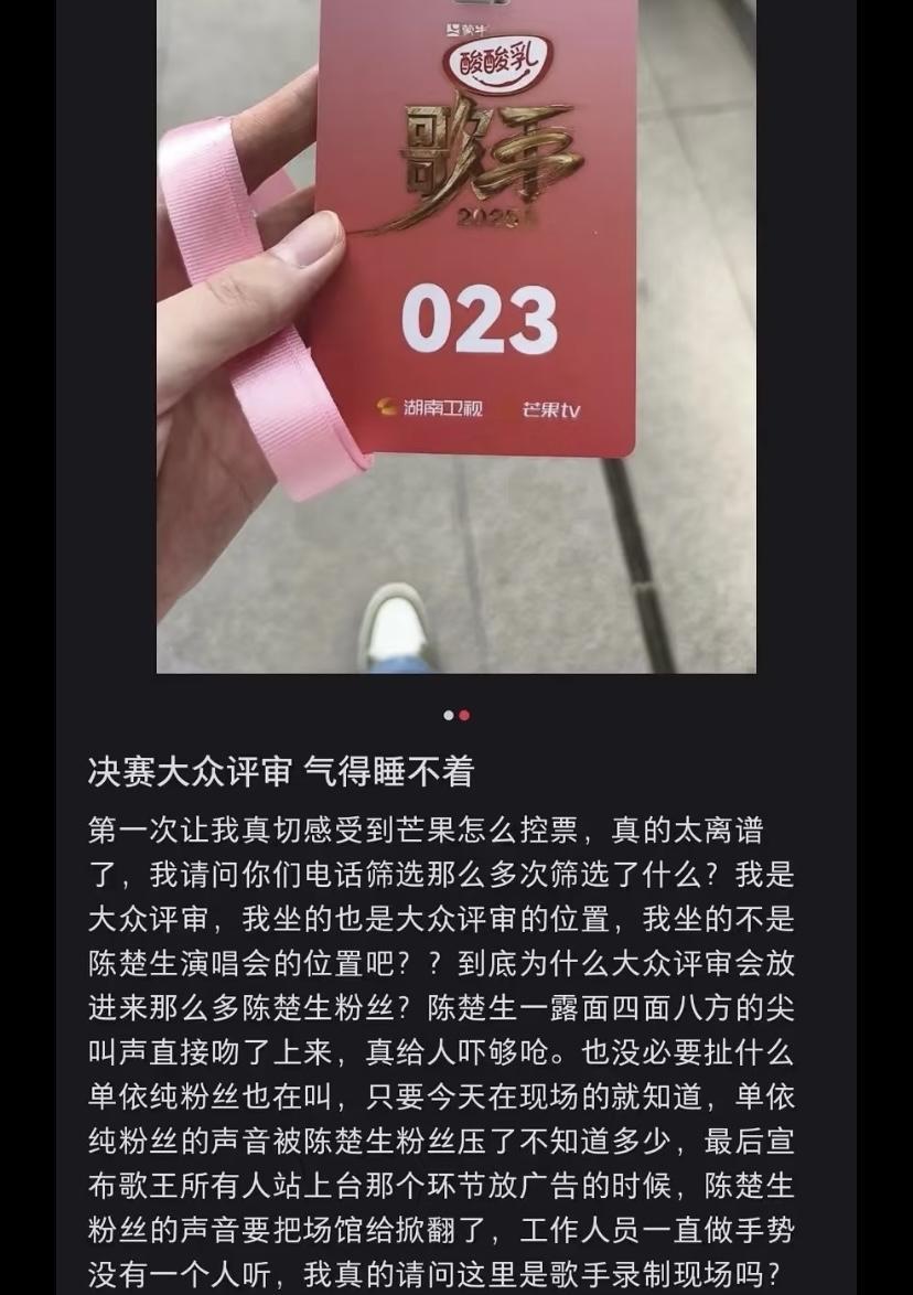 来看芒果是怎么一步一步把陈楚生送上歌王之位的。 首先是内定出场顺序,众所周知越早出场越不利,而第二轮比赛顺序是按第一轮倒序来,也就是说两轮里面总会有一轮处于劣势,除了最中间那个,没错,芒果台把陈楚生安排在第4个,这样两轮顺序都不错。 还有设备问题,alin的水平不用说,绝对是呼声很高的歌王候选人,芒果呢又开始使坏了,第一轮帮唱环节,下台后彭佳慧说自己耳返全程听不到声音,导致没有唱准,名次公布后自责地哭了好久。台媒都称“疑被设局”。 陈楚生好处占尽,还要在VCR里卖惨“我也希望我是皇”,《获奖之作》那句歌词“无论我多么平庸,也笑着领奖”更是让人想[吐]。