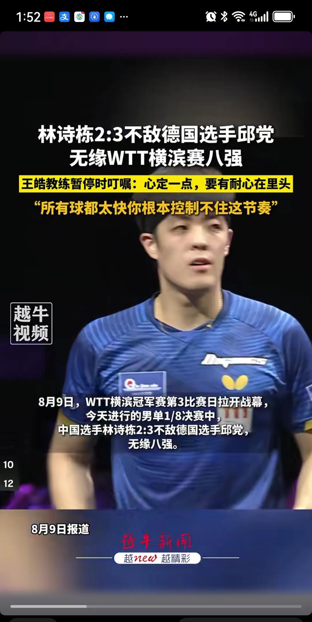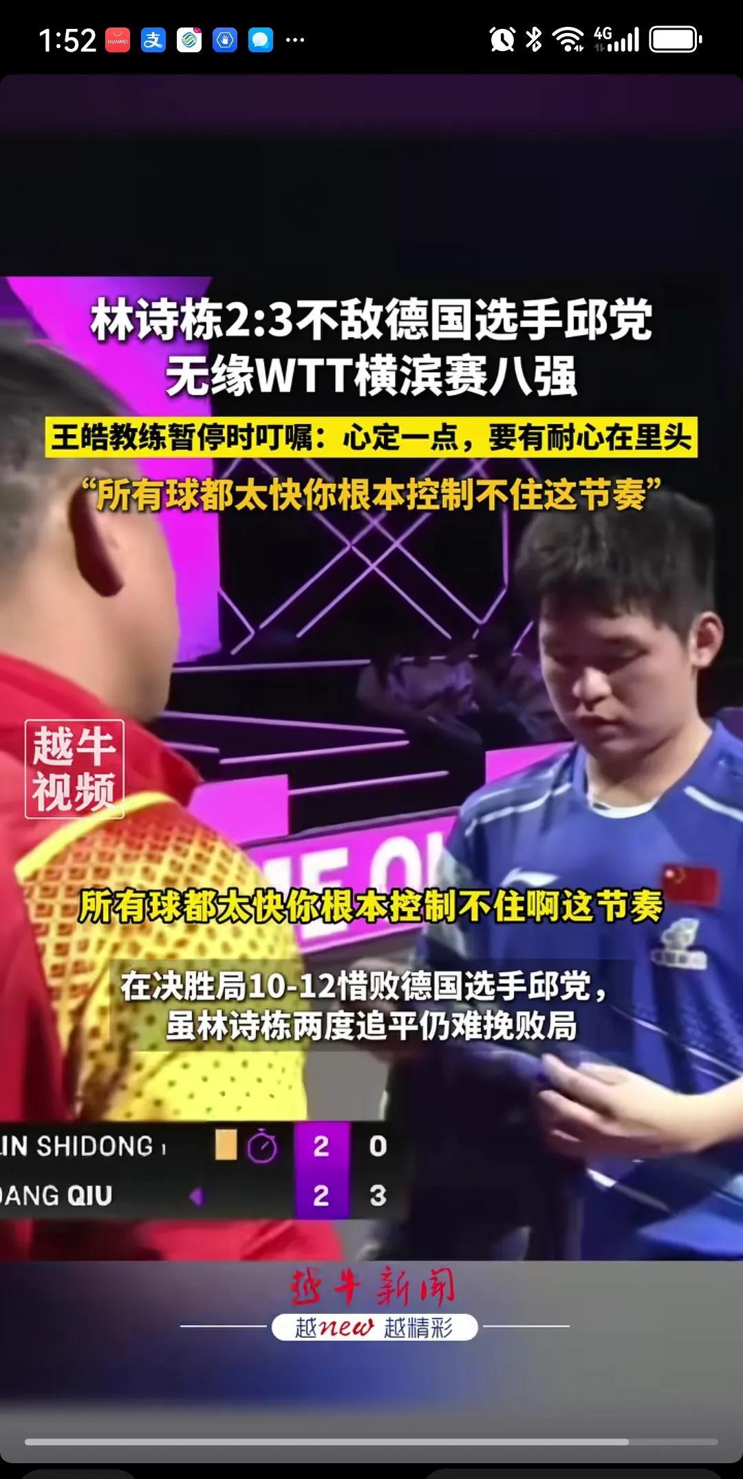林诗栋2:3负于邱党无缘八强之后,教练王浩非常失望,低头沉默,又一次流露出恨小石头不成钢的绝望。离开球馆时还是在复原本场比赛,对小石头谆谆教导。 比赛过程中,王皓叫了暂停一针见血的指出了林诗栋存在的问题:所有的球太快,你根本控制不住节奏,你要心定一点。 但林诗栋在决胜局还是没能控制住节奏,10:12败下阵了。 通过本场比赛感林诗栋的心理问题还是没有过关,技术层面也没有什么大的长进。