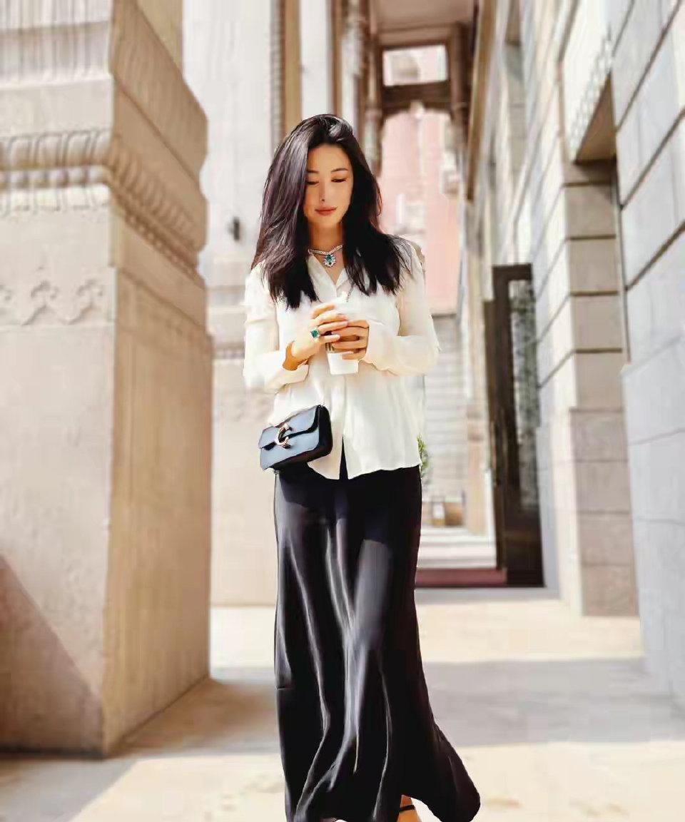 高圆圆朱珠又带火了白衬衫穿搭配半身裙、阔腿裤时髦又高级