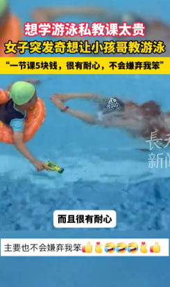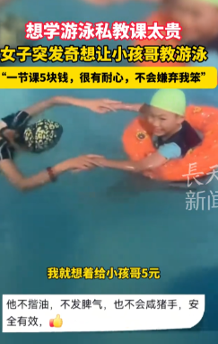 人怎么能这么聪明!”安徽阜阳,一女子想要学习游泳,但是又觉得买私教课太贵了,于是灵机一动,花了5块钱找了一个小男孩,专门教她学游泳!网友:这简直是一箭三雕的好办法!