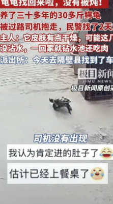 这是真幸运!”云南丽江,一女子饲养了30多年的鳄龟跑出大门,被一名路过的司机抱走,它走丢后,另只小点的鳄龟也不吃不喝了,女子发视频恳求对方能把鳄龟归还,会给予重谢,民警找了2天2夜,终于找到了司机,网友:养了三十年,跟家人没啥区别了! 女子是开饭店的,平常就把两只鳄龟放在店里供客人观赏,客人一多,女子就没时间照看鳄龟,结果较大的鳄龟趁人不注意,自己爬了出去。 等到女子发现后,开始满院子寻找,却始终不见踪迹,最终她只能从监控里寻找蛛丝马迹,结果还真发现有人把鳄龟带走了,女子重燃希望。 视频很清晰,车牌号也一目了然,女子养了那么长时间,早就有了很深厚的感情,于是报警,让民警帮帮她,晚找回一天,鳄龟就有一天的危险。 它在女子身边这么久,性情温良,她只希望鳄龟好好的,如果对方肯还给自己,就算花点钱也没事,但司机迟迟没有来找她,好在经过民警的努力,顺藤摸瓜找到了司机。 好在对方没有把鳄龟吃了,司机得知民警的来意后,主动将其还给了民警,女子看到完好无损的鳄龟后,原本的愁容瞬间消失,笑容压根掩饰不住。 虽然是鳄龟,但也是个生命,民警没有懈怠,这样的精神让女子感动,鳄龟重新回到原来的环境后,非常能吃,可见它还能再陪女子很久。 对于这件事情,大家有什么看法?