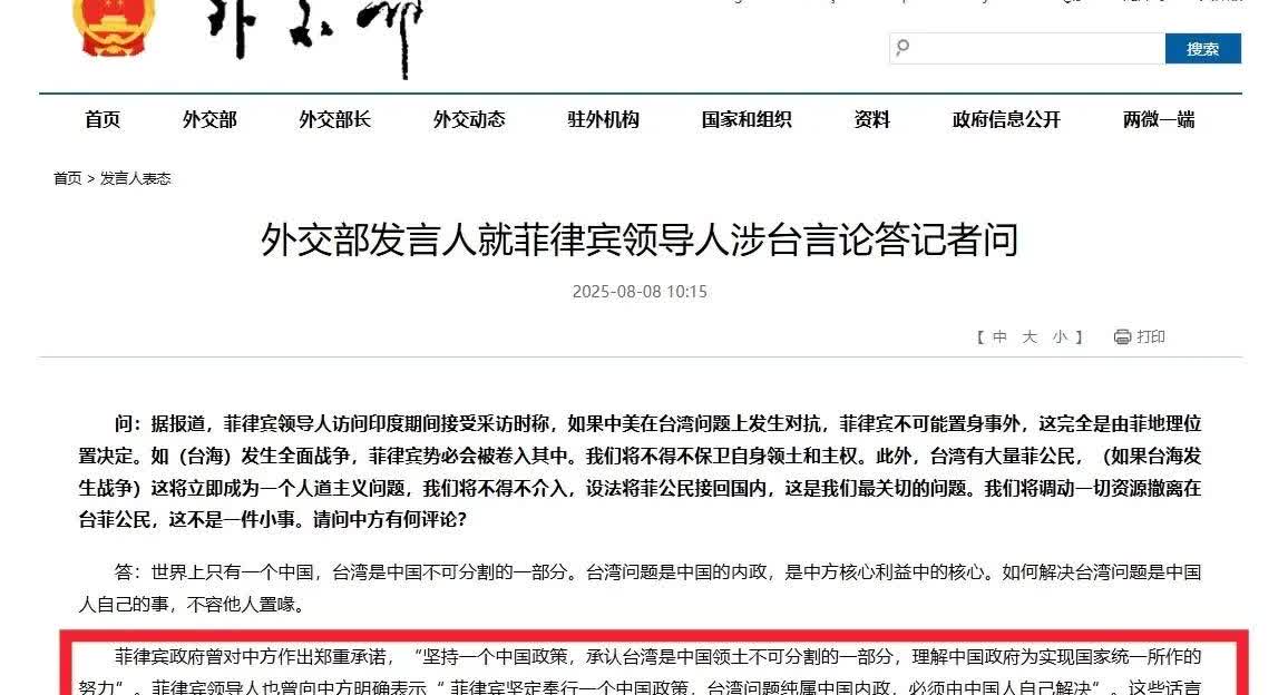 联合早报今天(8月9日)报道:“菲律宾总统小马科斯本周接受印媒专访时说,若台湾海峡两岸发生冲突,菲国‘无法置身事外’;中国外交部星期五(8月8日)则以不具名发言人的名义作出回应,警告菲国不要在中方核心利益问题上玩火。” 外交部发言人的回应是:“世界上只有一个中国,台湾是中国领土不可分割的一部分,台湾问题是中国的内政,是中方核心利益中的核心,如何解决台湾问题是中国人自己的事,不容他人置喙……(图2)”在反驳菲律宾的同时,中方派出3301、3304、4304舰组成的海警舰队进入台湾岛以南,菲律宾吕宋岛以北的巴士海峡,警告菲律宾不要自不量力,勿玩火,玩火者必自焚!