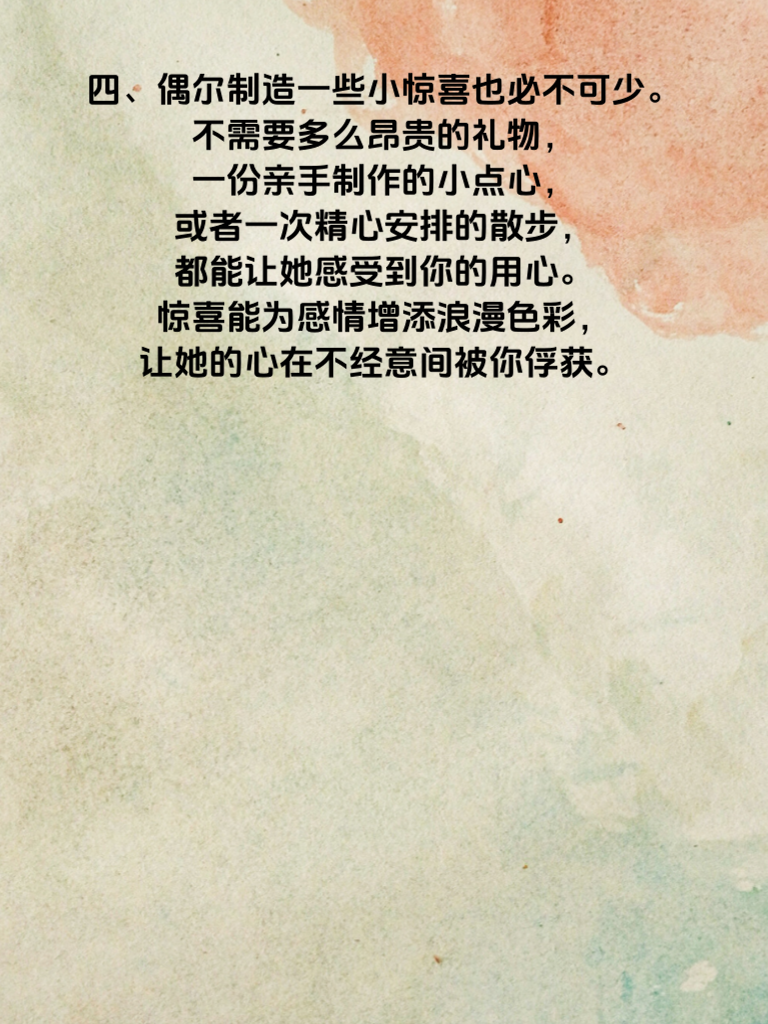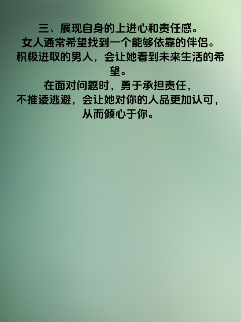 一、在追求女生的旅程中,真诚是打开她心门的第一把钥匙。男人若能坦诚相待,不藏着掖着,展现最真实的自己,往往更容易赢得女人的心。真诚的态度会让女生感受到你的信任,从而放下防备,拉近彼此的距离。 二、懂得倾听也是关键秘诀之一。当女生倾诉时,认真聆听她的喜怒哀乐,给予她充分的关注和理解。这不仅能让她觉得自己被重视,还能让她在你面前更放松。适时地给予回应和安慰,会让她在情感上更加依赖你。 三、展现自身的上进心和责任感。女人通常希望找到一个能够依靠的伴侣。积极进取的男人,会让她看到未来生活的希望。在面对问题时,勇于承担责任,不推诿逃避,会让她对你的人品更加认可,从而倾心于你。 四、偶尔制造一些小惊喜也必不可少。不需要多么昂贵的礼物,一份亲手制作的小点心,或者一次精心安排的散步,都能让她感受到你的用心。惊喜能为感情增添浪漫色彩,让她的心在不经意间被你俘获。