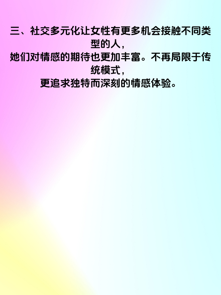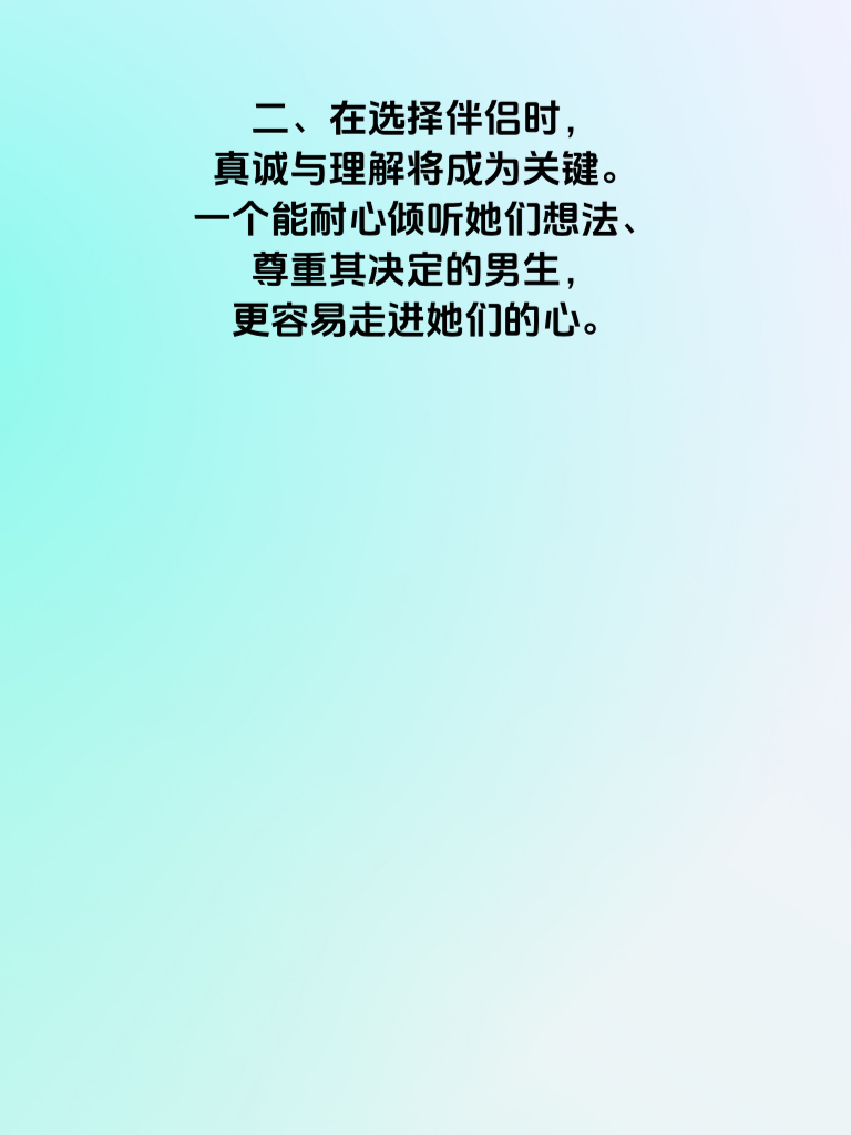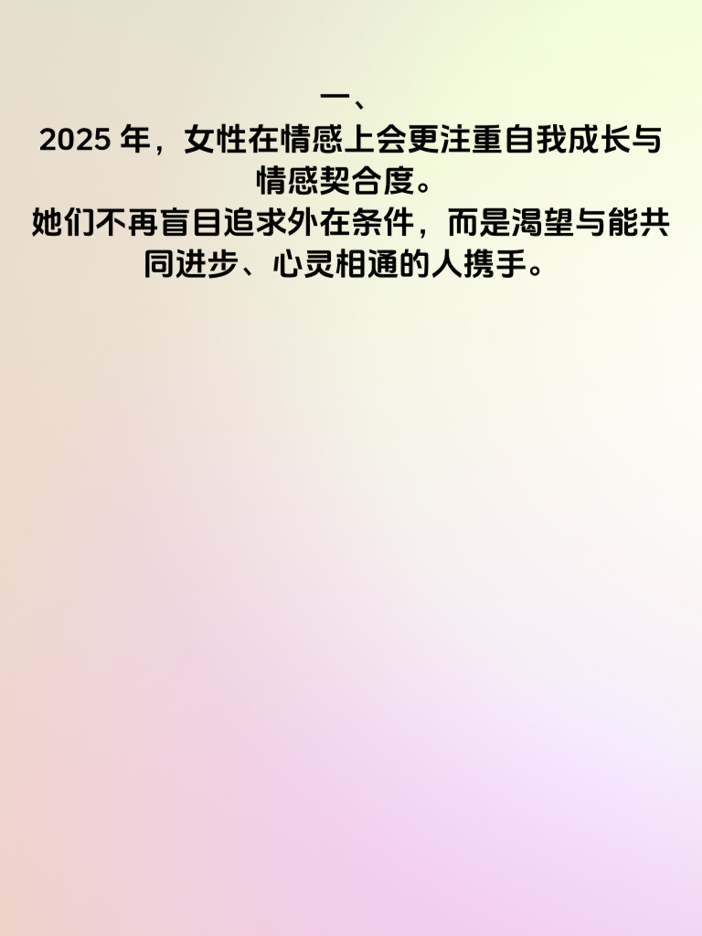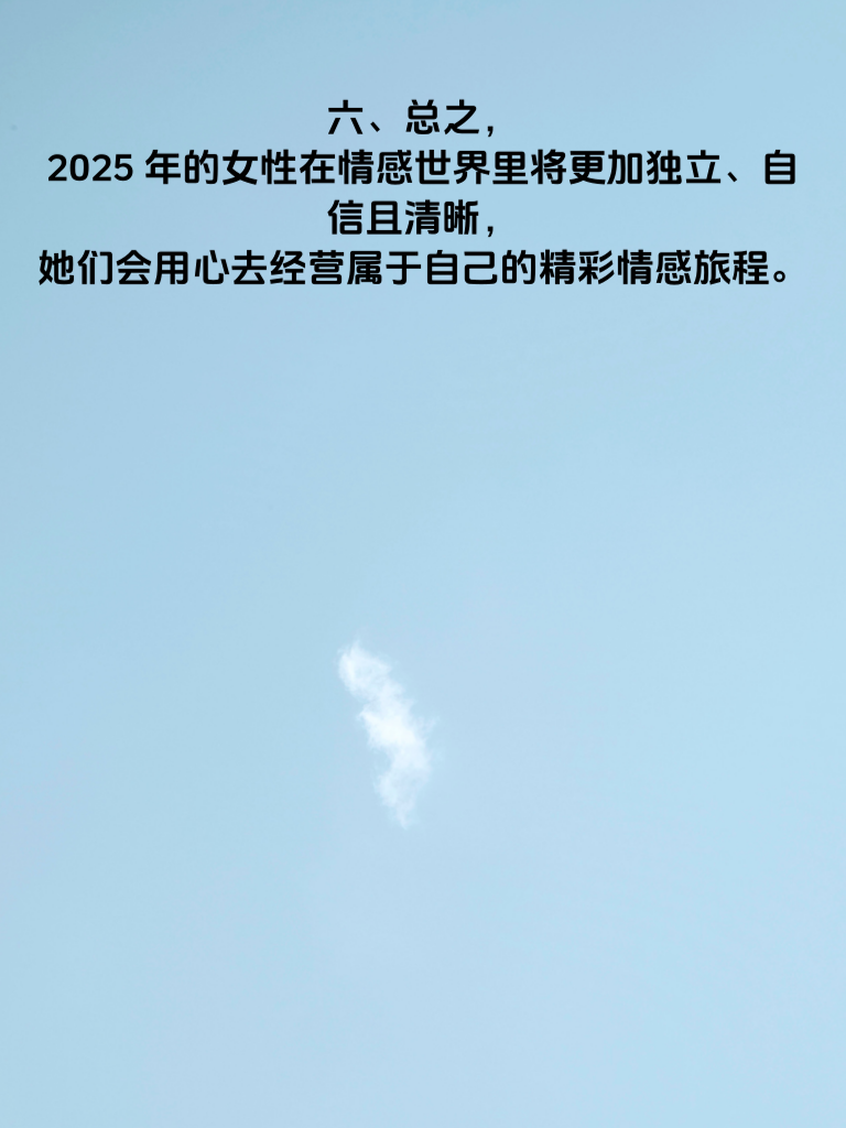 一、2025 年,女性在情感上会更注重自我成长与情感契合度。她们不再盲目追求外在条件,而是渴望与能共同进步、心灵相通的人携手。 二、在选择伴侣时,真诚与理解将成为关键。一个能耐心倾听她们想法、尊重其决定的男生,更容易走进她们的心。 三、社交多元化让女性有更多机会接触不同类型的人,她们对情感的期待也更加丰富。不再局限于传统模式,更追求独特而深刻的情感体验。 四、同时,女性会更勇敢地表达自己的情感需求。明确说出自己想要的相处方式和情感浓度,不再让对方猜测。 五、面对情感挫折,她们也将展现出更强的韧性。迅速调整心态,积极寻找新的生活乐趣,而不是一味沉浸在悲伤中。 六、总之,2025 年的女性在情感世界里将更加独立、自信且清晰,她们会用心去经营属于自己的精彩情感旅程。
