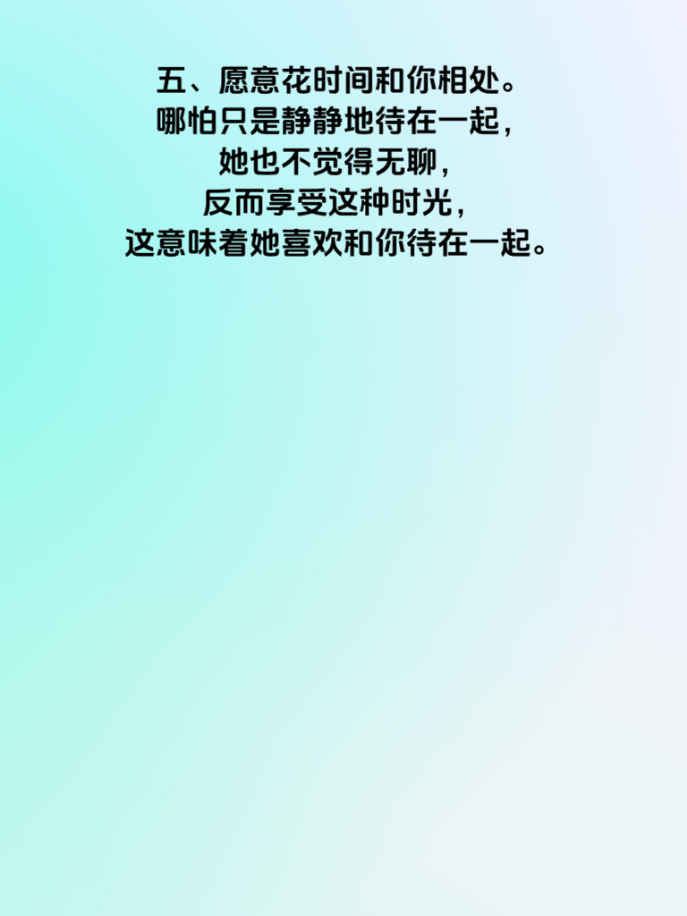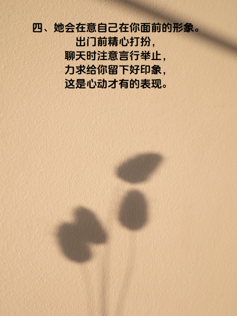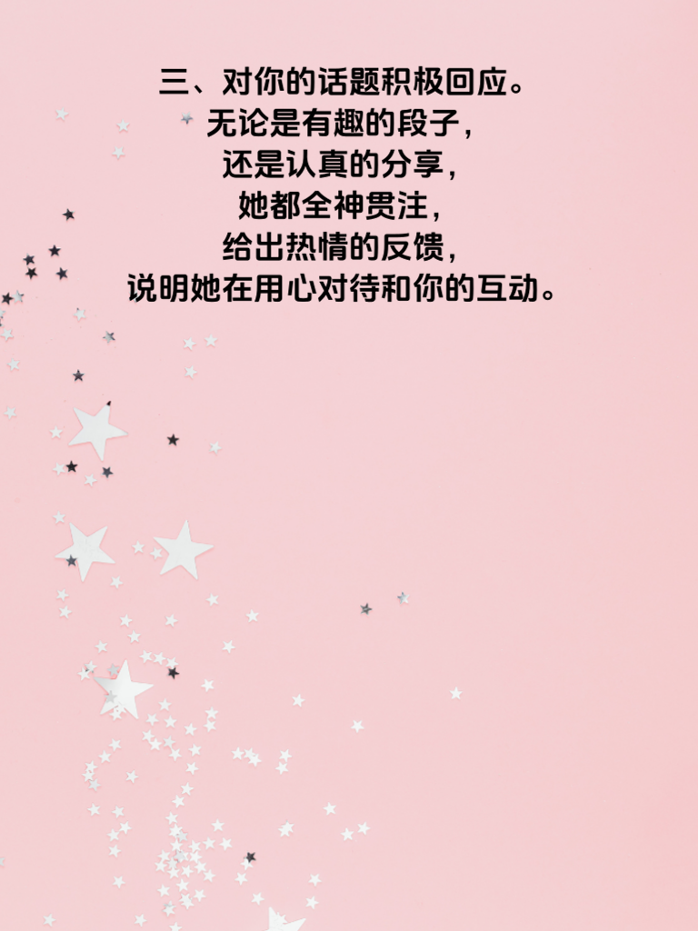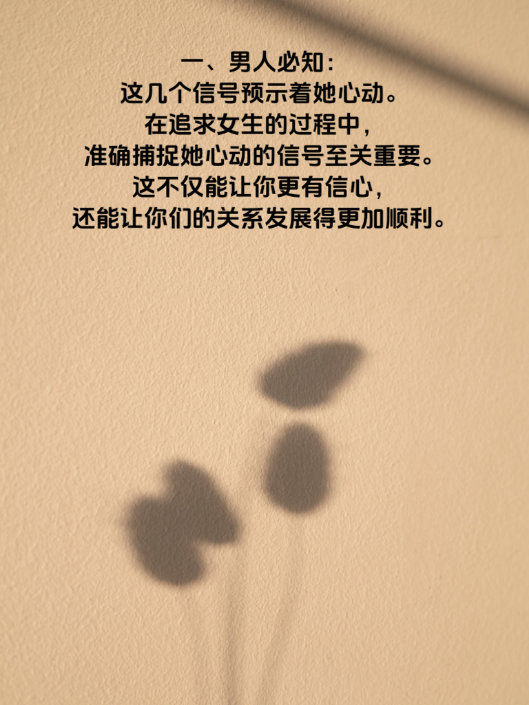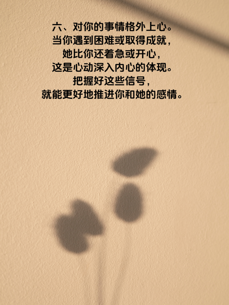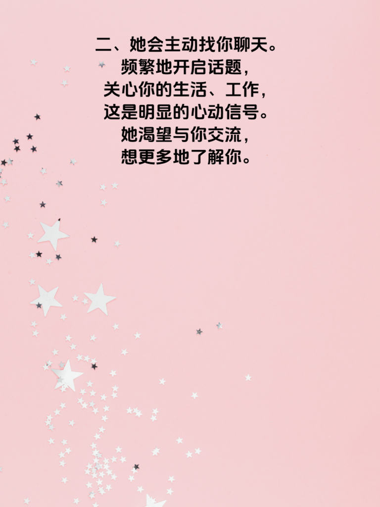 一、男人必知:这几个信号预示着她心动。在追求女生的过程中,准确捕捉她心动的信号至关重要。这不仅能让你更有信心,还能让你们的关系发展得更加顺利。 二、她会主动找你聊天。频繁地开启话题,关心你的生活、工作,这是明显的心动信号。她渴望与你交流,想更多地了解你。 三、对你的话题积极回应。无论是有趣的段子还是认真的分享,她都全神贯注,给出热情的反馈,说明她在用心对待和你的互动。 四、她会在意自己在你面前的形象。出门前精心打扮,聊天时注意言行举止,力求给你留下好印象,这是心动才有的表现。 五、愿意花时间和你相处。哪怕只是静静地待在一起,她也不觉得无聊,反而享受这种时光,这意味着她喜欢和你待在一起。 六、对你的事情格外上心。当你遇到困难或取得成就,她比你还着急或开心,这是心动深入内心的体现。把握好这些信号,就能更好地推进你和她的感情。