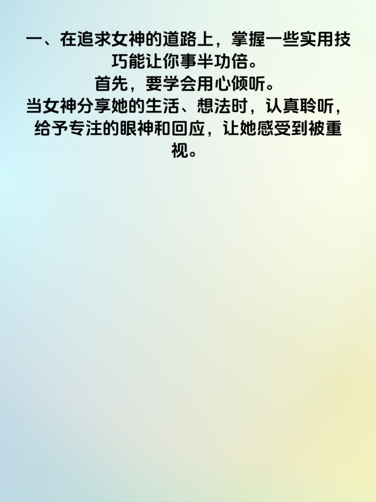 一、在追求女神的道路上,掌握一些实用技巧能让你事半功倍。首先,要学会用心倾听。当女神分享她的生活、想法时,认真聆听,给予专注的眼神和回应,让她感受到被重视。 二、展现你的独特魅力。每个人都有闪光点,找到自己的特长,无论是才华横溢的才艺,还是温暖贴心的性格优点,在相处中适时展现,吸引女神目光。 三、制造一些小惊喜。无需昂贵奢华,一份亲手制作的小点心,或是精心准备的一张手写卡片,都能在不经意间打动她的心,让她感受到你的用心。 四、保持适当的距离感。别过度纠缠,但也不能过于冷淡。把握好交流频率,偶尔给彼此一些空间,让她对你充满好奇,从而主动想要靠近你,了解你更多。