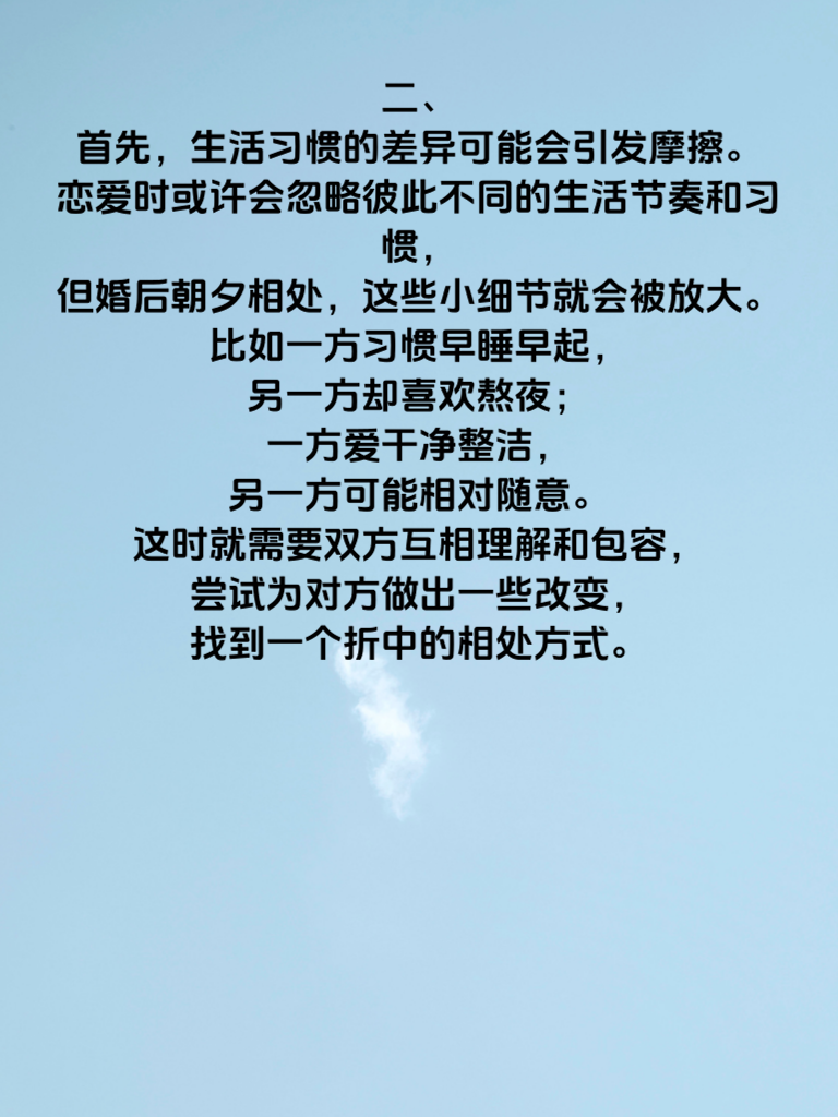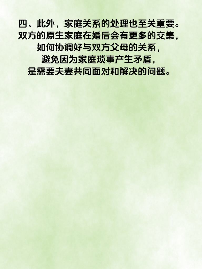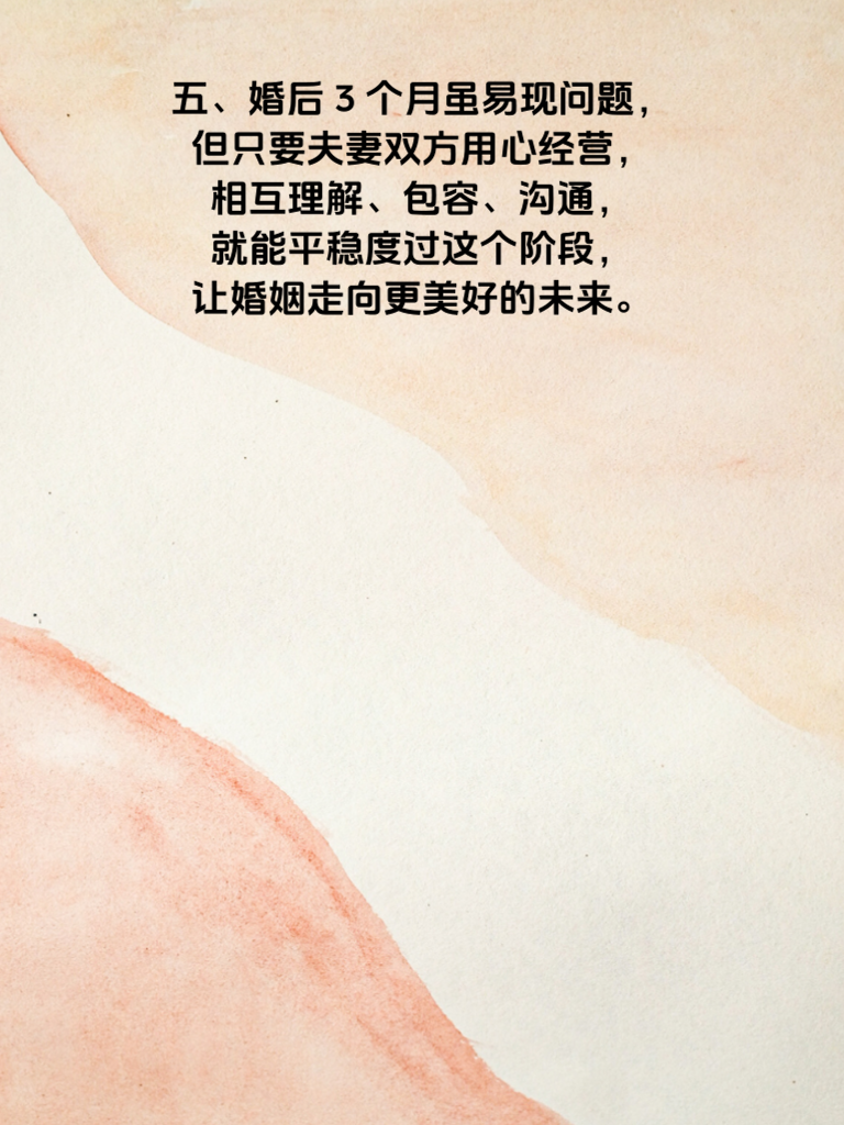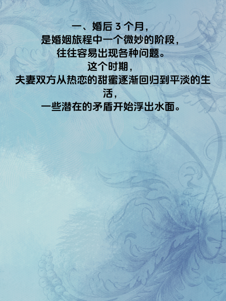 一、婚后3个月,是婚姻旅程中一个微妙的阶段,往往容易出现各种问题。这个时期,夫妻双方从热恋的甜蜜逐渐回归到平淡的生活,一些潜在的矛盾开始浮出水面。 二、首先,生活习惯的差异可能会引发摩擦。恋爱时或许会忽略彼此不同的生活节奏和习惯,但婚后朝夕相处,这些小细节就会被放大。比如一方习惯早睡早起,另一方却喜欢熬夜;一方爱干净整洁,另一方可能相对随意。这时就需要双方互相理解和包容,尝试为对方做出一些改变,找到一个折中的相处方式。 三、经济问题也可能成为矛盾点。婚后共同管理钱财,可能会因为消费观念的不同产生分歧。一方注重储蓄,另一方则更倾向于享受当下。这就需要夫妻坦诚沟通,制定合理的理财计划,平衡好储蓄和生活品质的关系。 四、此外,家庭关系的处理也至关重要。双方的原生家庭在婚后会有更多的交集,如何协调好与双方父母的关系,避免因为家庭琐事产生矛盾,是需要夫妻共同面对和解决的问题。 五、婚后3个月虽易现问题,但只要夫妻双方用心经营,相互理解、包容、沟通,就能平稳度过这个阶段,让婚姻走向更美好的未来。