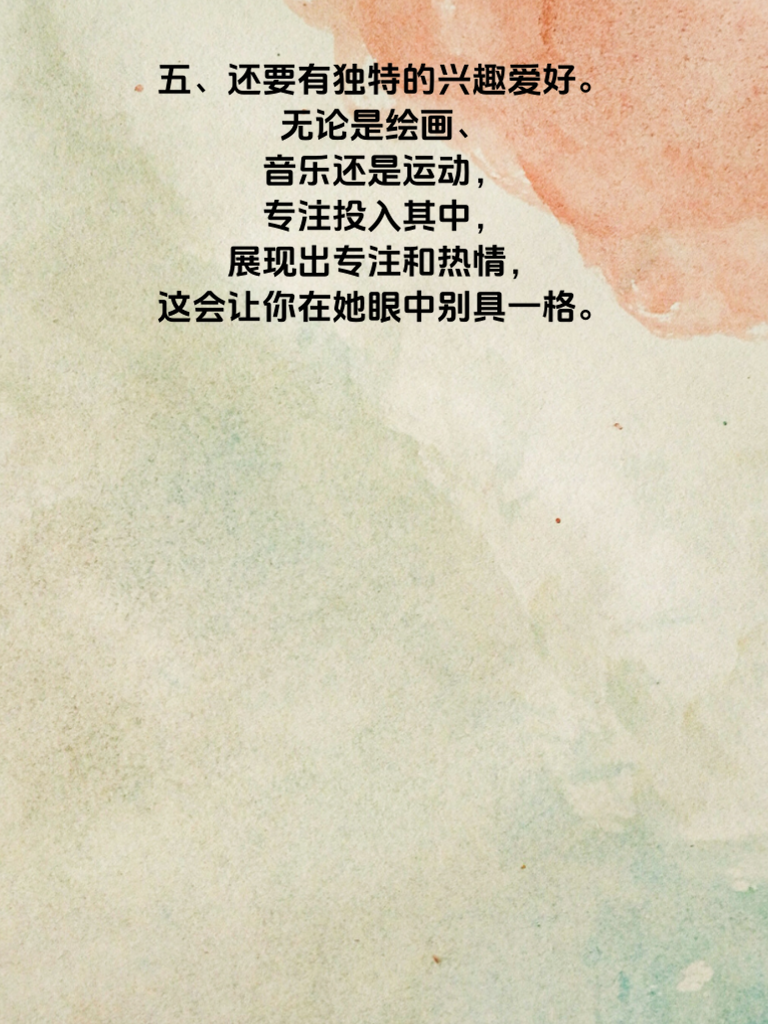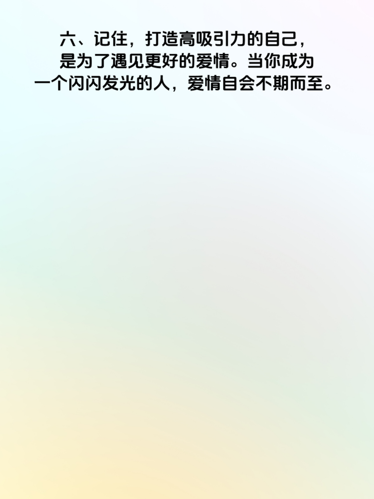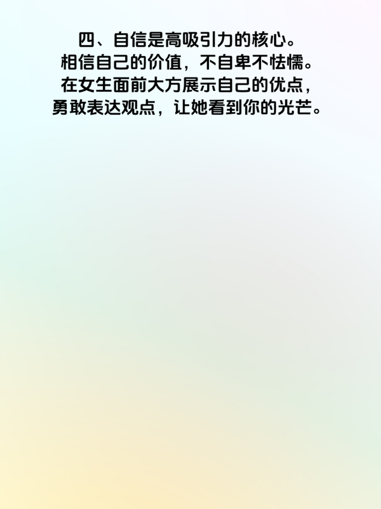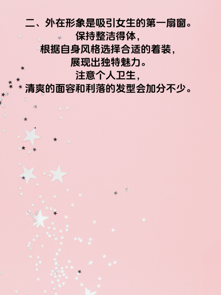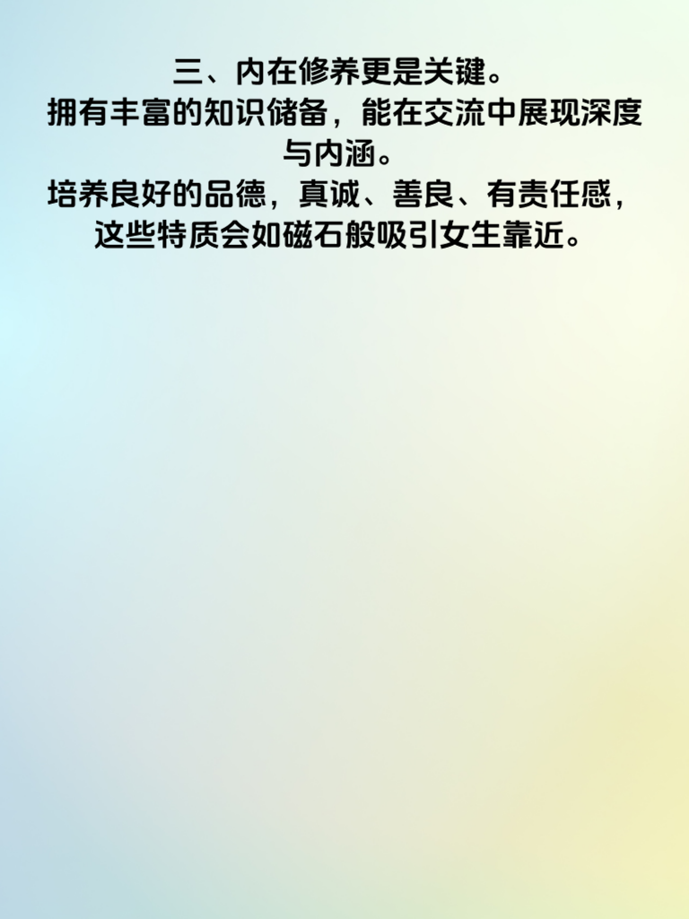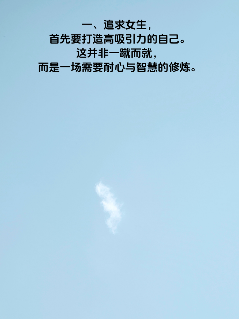 一、追求女生,首先要打造高吸引力的自己。这并非一蹴而就,而是一场需要耐心与智慧的修炼。 二、外在形象是吸引女生的第一扇窗。保持整洁得体,根据自身风格选择合适的着装,展现出独特魅力。注意个人卫生,清爽的面容和利落的发型会加分不少。 三、内在修养更是关键。拥有丰富的知识储备,能在交流中展现深度与内涵。培养良好的品德,真诚、善良、有责任感,这些特质会如磁石般吸引女生靠近。 四、自信是高吸引力的核心。相信自己的价值,不自卑不怯懦。在女生面前大方展示自己的优点,勇敢表达观点,让她看到你的光芒。 五、还要有独特的兴趣爱好。无论是绘画、音乐还是运动,专注投入其中,展现出专注和热情,这会让你在她眼中别具一格。 六、记住,打造高吸引力的自己,是为了遇见更好的爱情。当你成为一个闪闪发光的人,爱情自会不期而至。