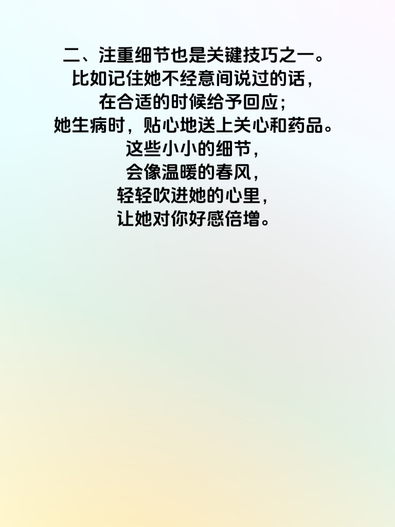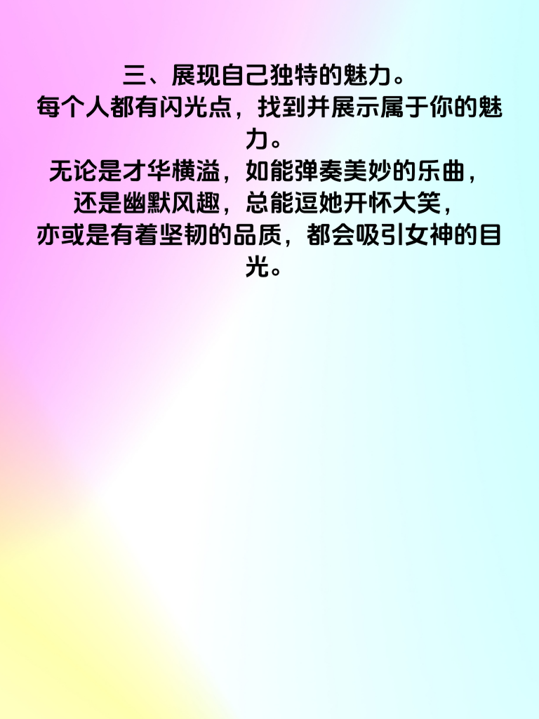 一、想要成功捕捉女神的心,首先要学会真诚待人。女神们大多心思细腻,她们能轻易察觉到你的真诚与否。所以,在与她相处时,不要有任何虚伪的伪装,真心地关心她、理解她,让她感受到你是真实且可靠的。 二、注重细节也是关键技巧之一。比如记住她不经意间说过的话,在合适的时候给予回应;她生病时,贴心地送上关心和药品。这些小小的细节,会像温暖的春风,轻轻吹进她的心里,让她对你好感倍增。 三、展现自己独特的魅力。每个人都有闪光点,找到并展示属于你的魅力。无论是才华横溢,如能弹奏美妙的乐曲,还是幽默风趣,总能逗她开怀大笑,亦或是有着坚韧的品质,都会吸引女神的目光。 四、尊重她的想法和选择。在交流中,认真倾听她的观点,不要轻易否定。即使有不同意见,也以平和理性的方式沟通,让她知道你尊重她的独立人格,这样她会更愿意靠近你。