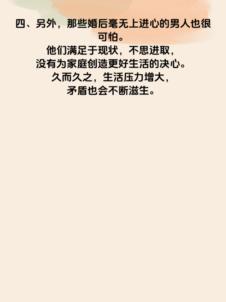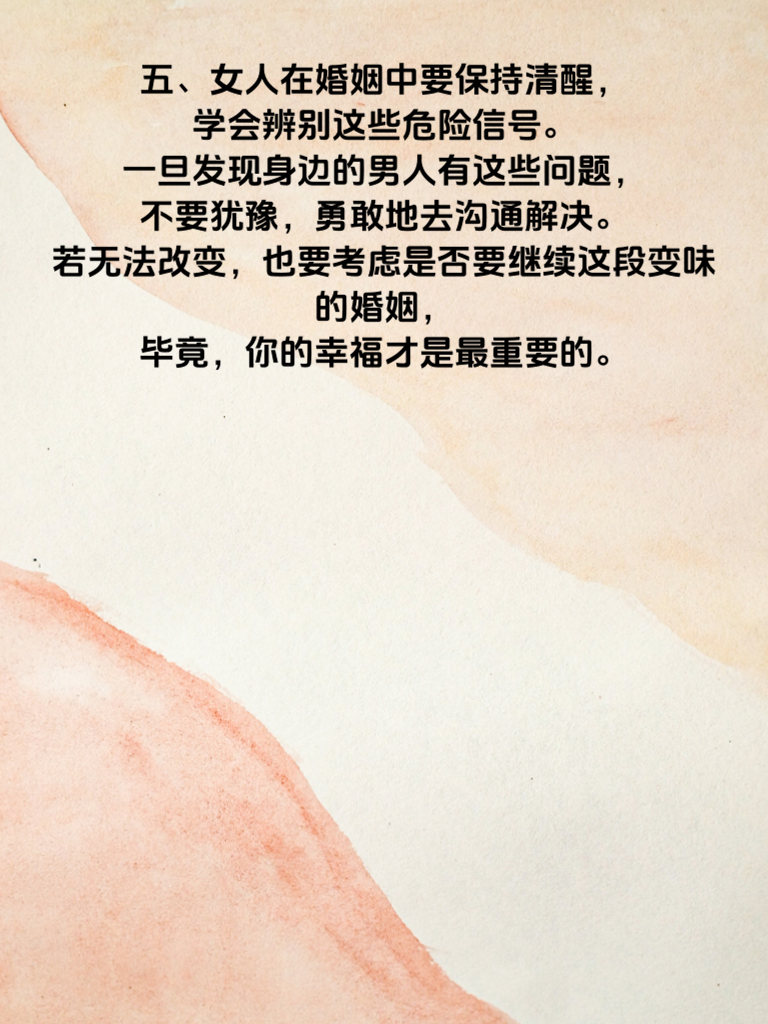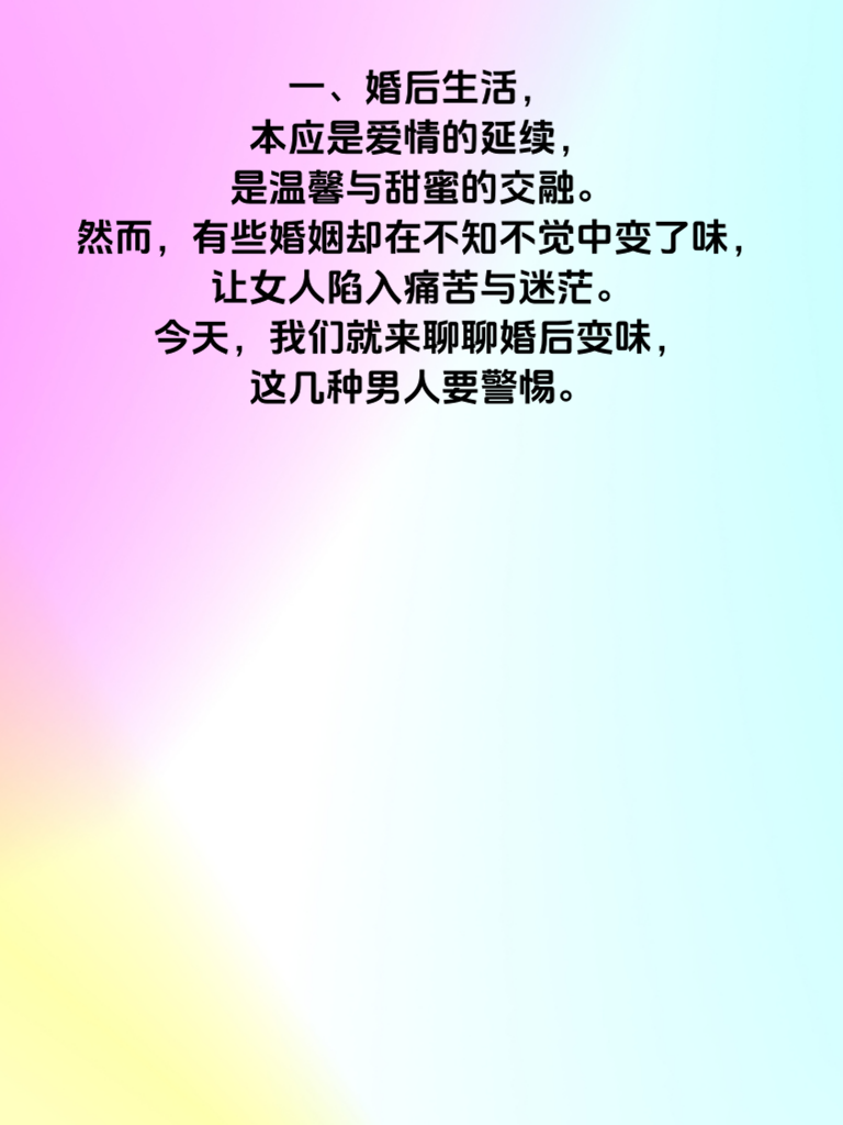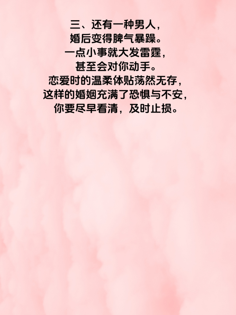 一、婚后生活,本应是爱情的延续,是温馨与甜蜜的交融。然而,有些婚姻却在不知不觉中变了味,让女人陷入痛苦与迷茫。今天,我们就来聊聊婚后变味,这几种男人要警惕。 二、第一种要警惕的男人,是婚后变得懒惰的人。婚前他或许会主动承担家务,对你关怀备至。可婚后,他却开始变得油瓶倒了都不扶,整天只知道打游戏、刷手机,把家里的大小事务都丢给你。这种男人,不仅让你身心疲惫,更让婚姻失去了应有的温暖。 三、还有一种男人,婚后变得脾气暴躁。一点小事就大发雷霆,甚至会对你动手。恋爱时的温柔体贴荡然无存,这样的婚姻充满了恐惧与不安,你要尽早看清,及时止损。 四、另外,那些婚后毫无上进心的男人也很可怕。他们满足于现状,不思进取,没有为家庭创造更好生活的决心。久而久之,生活压力增大,矛盾也会不断滋生。 五、女人在婚姻中要保持清醒,学会辨别这些危险信号。一旦发现身边的男人有这些问题,不要犹豫,勇敢地去沟通解决。若无法改变,也要考虑是否要继续这段变味的婚姻,毕竟,你的幸福才是最重要的。