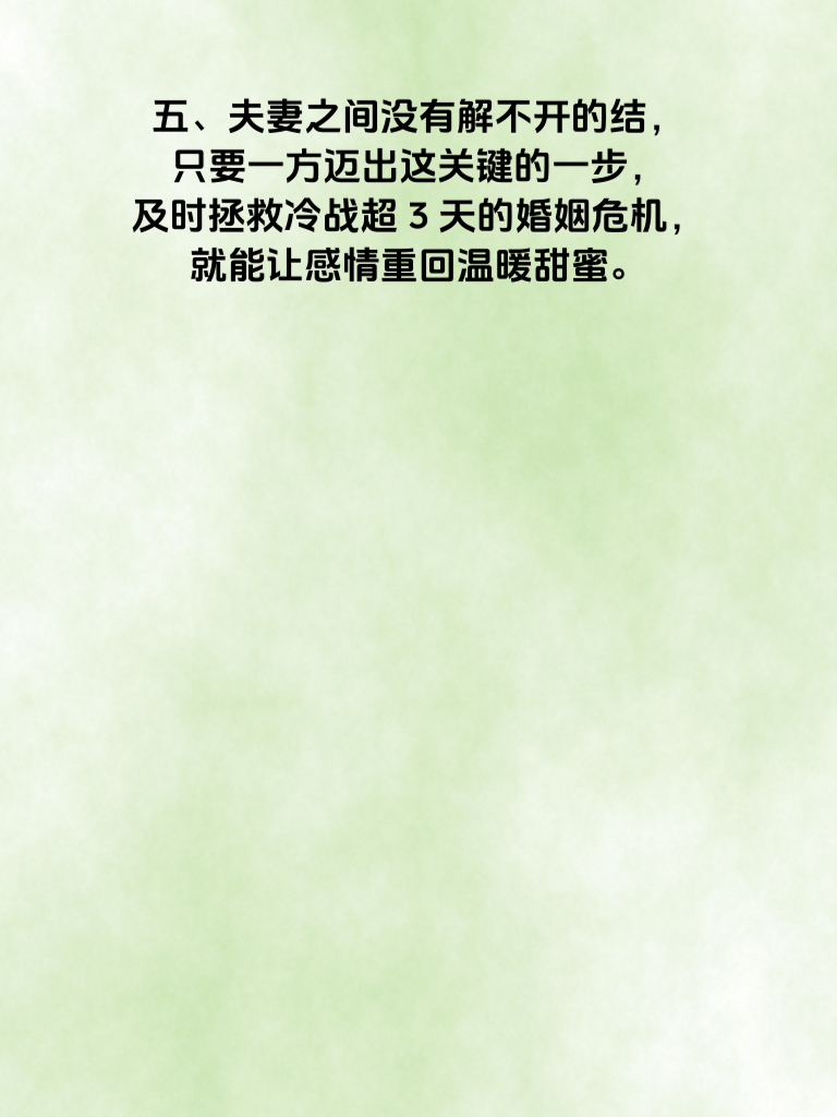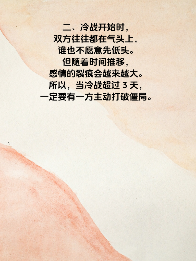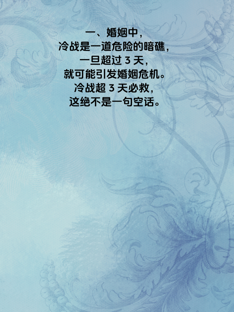 一、婚姻中,冷战是一道危险的暗礁,一旦超过3天,就可能引发婚姻危机。冷战超3天必救,这绝不是一句空话。 二、冷战开始时,双方往往都在气头上,谁也不愿意先低头。但随着时间推移,感情的裂痕会越来越大。所以,当冷战超过3天,一定要有一方主动打破僵局。 三、主动的一方可以选择一个恰当的时机,比如对方心情看起来还不错的时候,真诚地表达自己的感受。不要指责对方,而是说“我这几天心里不好受,咱们别再冷战了”。 四、也可以准备一份小惊喜,不需要多贵重,一束花或者一份对方喜欢的小点心。用这份心意融化冷战带来的冰冷。 五、夫妻之间没有解不开的结,只要一方迈出这关键的一步,及时拯救冷战超3天的婚姻危机,就能让感情重回温暖甜蜜。
