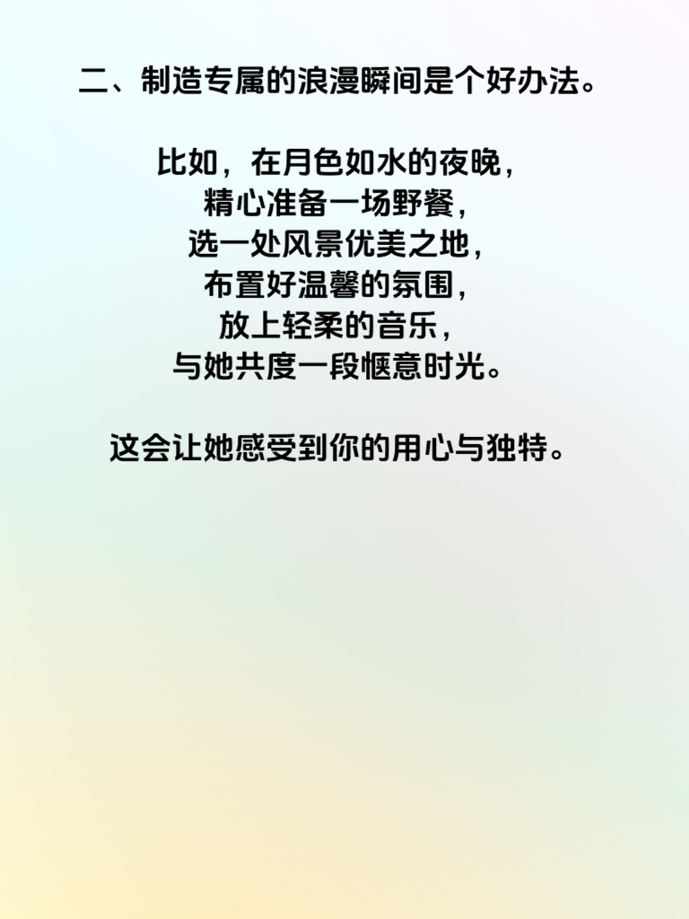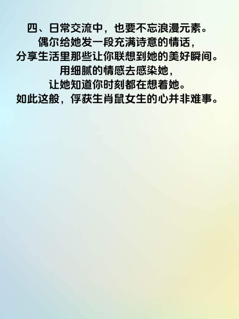 一、生肖鼠的女生,内心细腻且充满浪漫情怀。她们渴望在爱情里,能被对方用心对待,每一个特别的日子都不被遗忘。追求生肖鼠女生,浪漫是打开她们心门的钥匙。 二、制造专属的浪漫瞬间是个好办法。比如,在月色如水的夜晚,精心准备一场野餐,选一处风景优美之地,布置好温馨的氛围,放上轻柔的音乐,与她共度一段惬意时光。这会让她感受到你的用心与独特。 三、送礼物也不能马虎。了解她的喜好,送一份能打动她的礼物。若是她喜欢阅读,一本精心挑选的小众好书;若是她热爱美妆,一套心仪已久的化妆品。礼物无需贵重,关键是能送到她心坎上。 四、日常交流中,也要不忘浪漫元素。偶尔给她发一段充满诗意的情话,分享生活里那些让你联想到她的美好瞬间。用细腻的情感去感染她,让她知道你时刻都在想着她。如此这般,俘获生肖鼠女生的心并非难事。