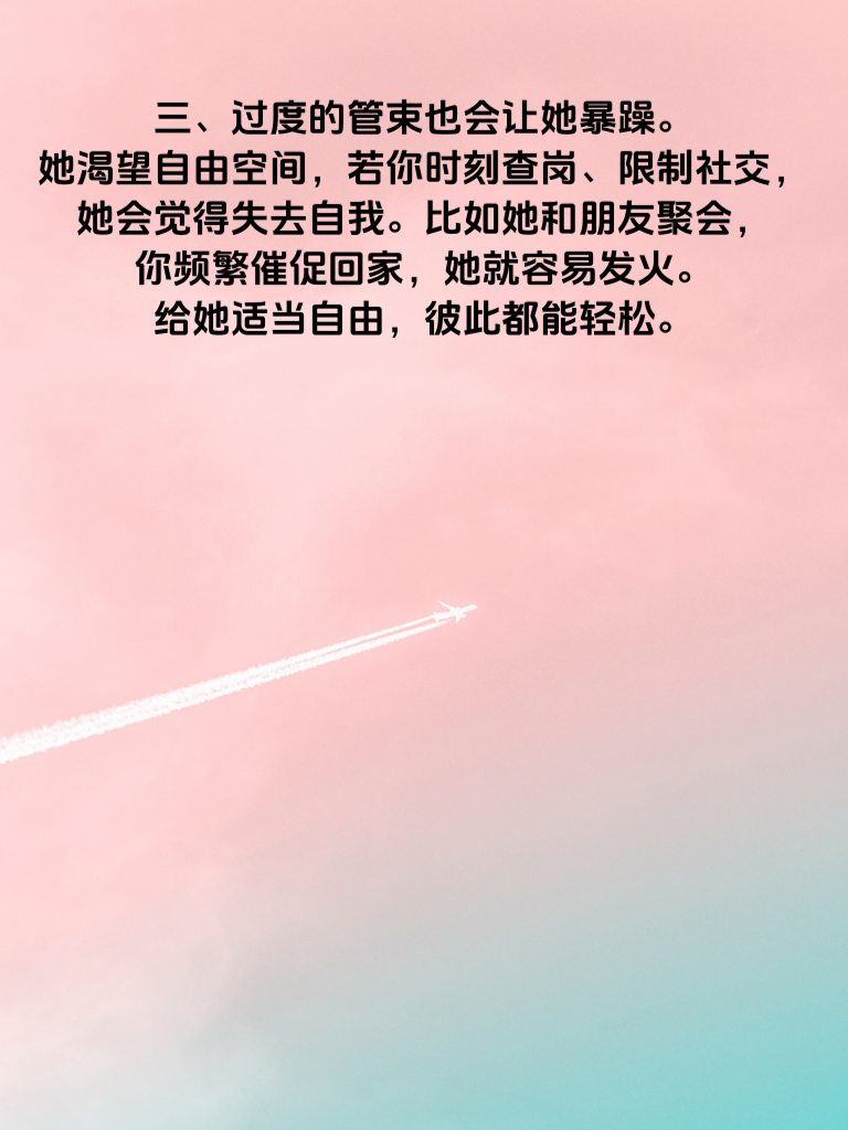 一、女生情绪暴躁时,往往在躲避被误解。当她满心委屈地解释,换来的却是你的质疑,那怒火便会瞬间点燃。比如她加班后疲惫回家,你却指责她不顾家,这会让她情绪失控。所以,倾听她的解释,给予信任,是避免她暴躁的关键。 二、她也在躲不被尊重。若你总忽视她的意见,擅自做决定,她会觉得自己不被重视。像是家庭出游地点你独断专行,她的想法被无视,自然会暴躁。尊重她的想法,共同商量,能让她心情舒畅。 三、过度的管束也会让她暴躁。她渴望自由空间,若你时刻查岗、限制社交,她会觉得失去自我。比如她和朋友聚会,你频繁催促回家,她就容易发火。给她适当自由,彼此都能轻松。 四、还有被比较。当你拿她和别人作比较,说她不如他人时,她的自尊心会受挫,情绪也会爆发。比如夸同事工作能力强,贬低她,这绝对不行。多发现她的闪光点,真诚赞美,她会更温柔。