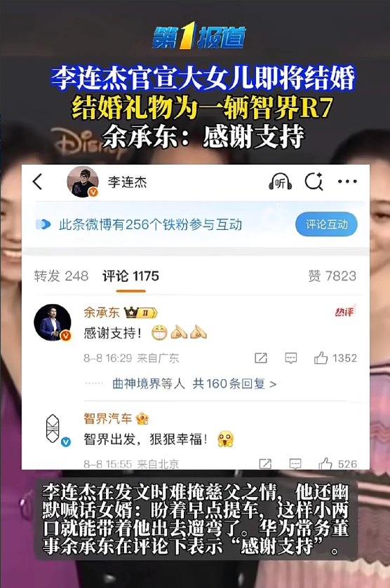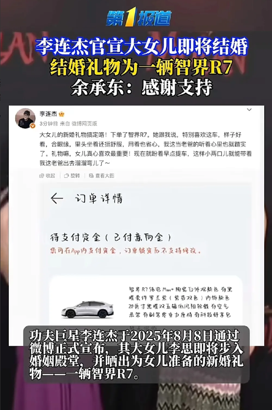 余承东感谢了李连杰,李连杰给大女儿买了一辆华为智界的新款汽车,并且发到微博上了。李连杰的影响力,这一条信息相当于几十万一条的广告。李连杰这个女儿是和前妻黄秋燕生的,长的很漂亮,很耐看,希望她能一直幸福下去。