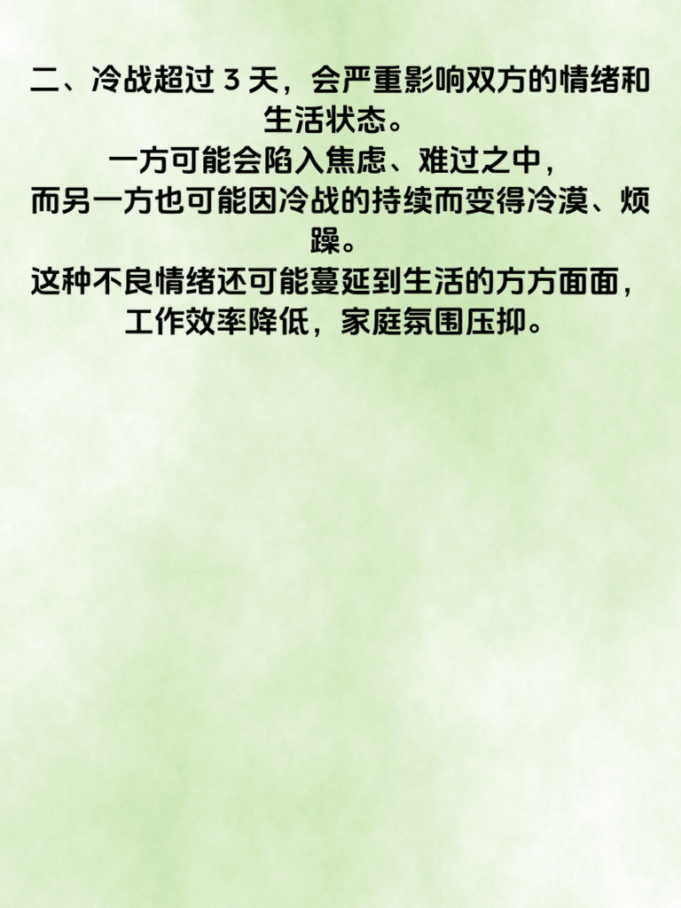 一、夫妻冷战超过3天,往往会让彼此之间的隔阂越来越深。沉默不语就像一道道无形的墙,将两颗原本亲密的心慢慢隔开。每一次的冷战,都是情感交流的中断,爱意在这冰冷的氛围中逐渐被消耗。 二、冷战超过3天,会严重影响双方的情绪和生活状态。一方可能会陷入焦虑、难过之中,而另一方也可能因冷战的持续而变得冷漠、烦躁。这种不良情绪还可能蔓延到生活的方方面面,工作效率降低,家庭氛围压抑。 三、长期的冷战还可能导致信任危机。当冷战持续,双方都不再坦诚沟通,就会对彼此的行为产生无端猜测,怀疑对方是否还爱着自己,是否有了其他心思。原本坚固的信任基石,在冷战中摇摇欲坠。 四、要避免冷战带来的危害,及时沟通是关键。当矛盾出现,不要憋在心里,勇敢地表达自己的想法和感受。倾听对方的观点,共同寻找解决问题的方法。只有打破沉默,才能让爱重新温暖彼此的心,让婚姻重回幸福的轨道。