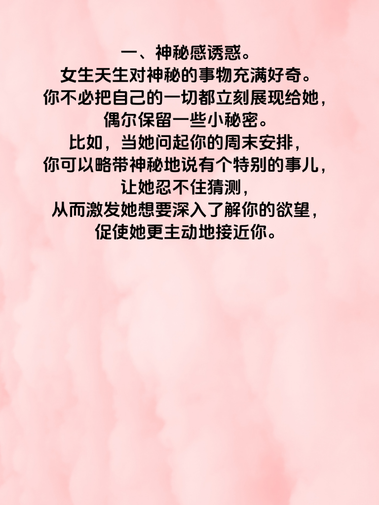 一、神秘感诱惑。女生天生对神秘的事物充满好奇。你不必把自己的一切都立刻展现给她,偶尔保留一些小秘密。比如,当她问起你的周末安排,你可以略带神秘地说有个特别的事儿,让她忍不住猜测,从而激发她想要深入了解你的欲望,促使她更主动地接近你。 二、才华诱惑。拥有独特的才华会让你魅力大增。无论是擅长绘画、唱歌、弹吉他,还是有着超强的逻辑思维能轻松解决难题。在适当的时候展示你的才华,比如在聚会中露一手,会让她对你刮目相看,进而主动向你抛出橄榄枝,渴望走进你的才华世界。 三、自信诱惑。自信的男人走路都带风。保持积极的心态,相信自己的价值。面对她时,眼神坚定,举止大方。自信会传递出一种可靠的感觉,让她觉得你能掌控生活,她会被这种自信所吸引,主动靠近你,想要成为你生活中的一部分。