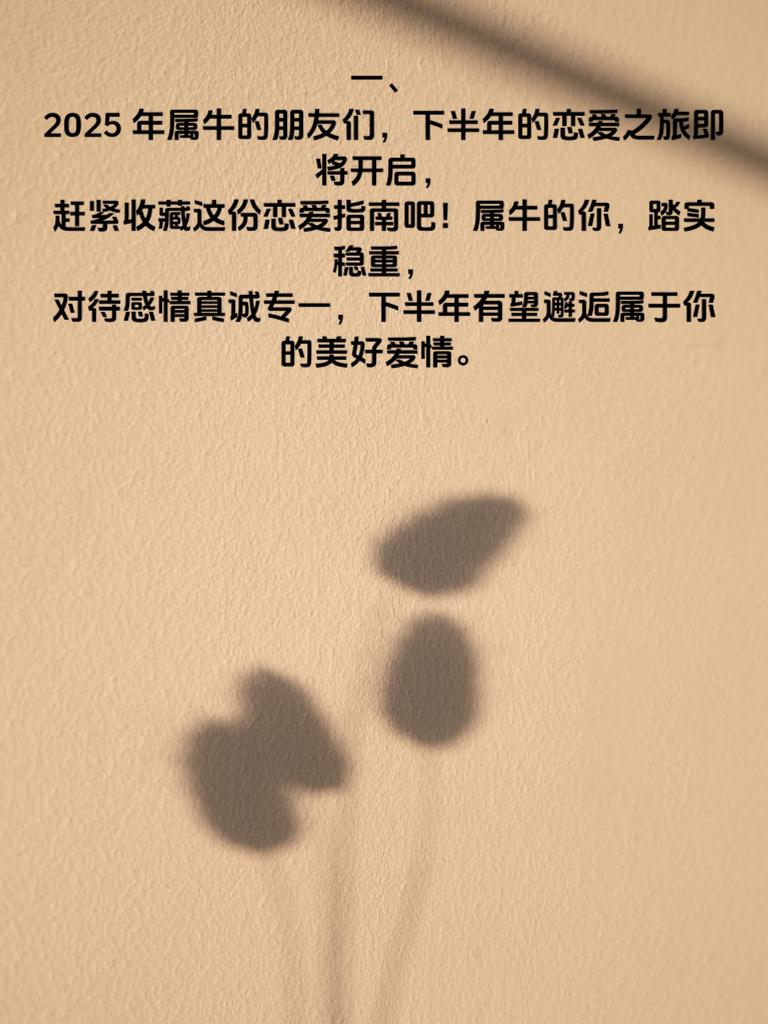 一、2025 年属牛的朋友们,下半年的恋爱之旅即将开启,赶紧收藏这份恋爱指南吧!属牛的你,踏实稳重,对待感情真诚专一,下半年有望邂逅属于你的美好爱情。 二、首先,要保持积极乐观的心态。不要因为工作或生活中的琐事而变得消极,乐观的你会更具吸引力。主动走出舒适区,多参加一些社交活动,扩大自己的社交圈子,增加遇见心仪对象的机会。 三、在与人交往中,展现出你的真诚与热情。真诚是打动人心的法宝,用心去倾听对方的想法,用热情去回应每一次交流。当遇到心动的人时,勇敢地迈出第一步,主动打招呼,开启对话。 四、注意自身形象管理。整洁得体的外表会给人留下良好的第一印象。注重个人卫生,穿着适合自己风格的服装,展现出自信大方的气质。 五、最重要的是,相信缘分。爱情有时候就是在不经意间降临,保持一颗平常心,耐心等待那个对的人出现。只要你做好准备,下半年的恋爱好运说不定就会降临到属牛的你身上哦!