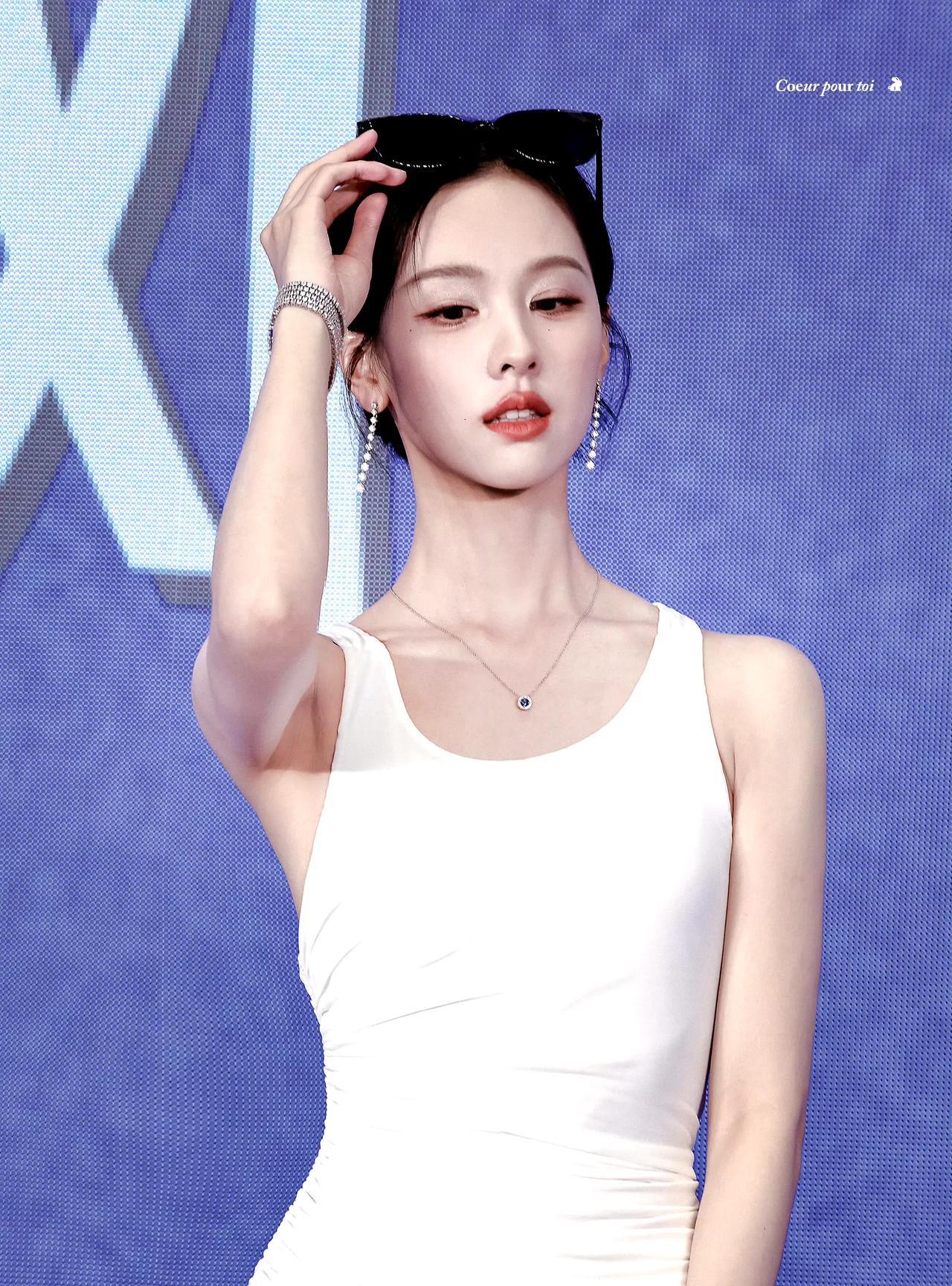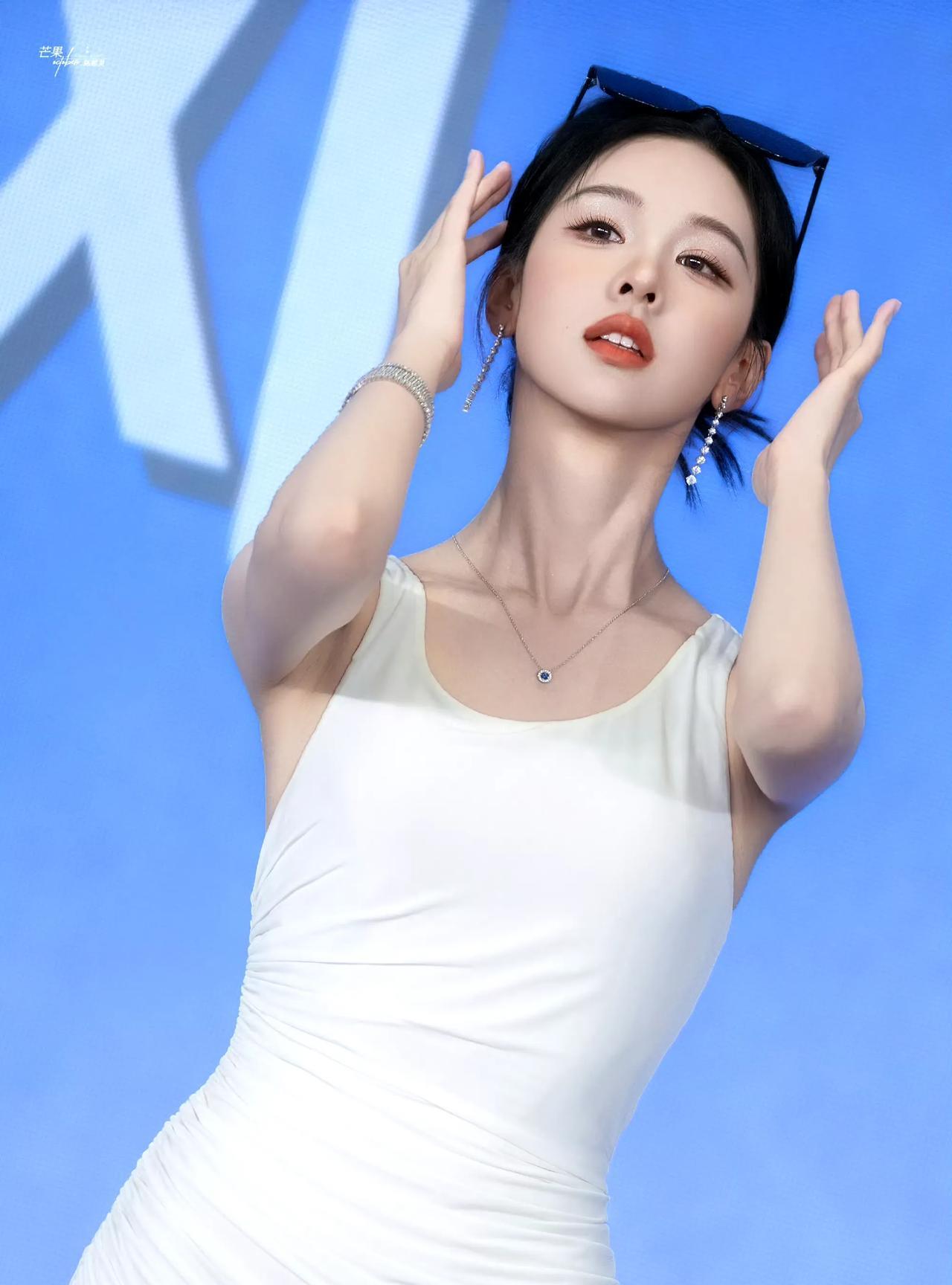 #陈都灵#素白褶皱裙勾勒身体线条,钻饰在光影里流转。墨镜添飒爽,比耶藏清甜,举手