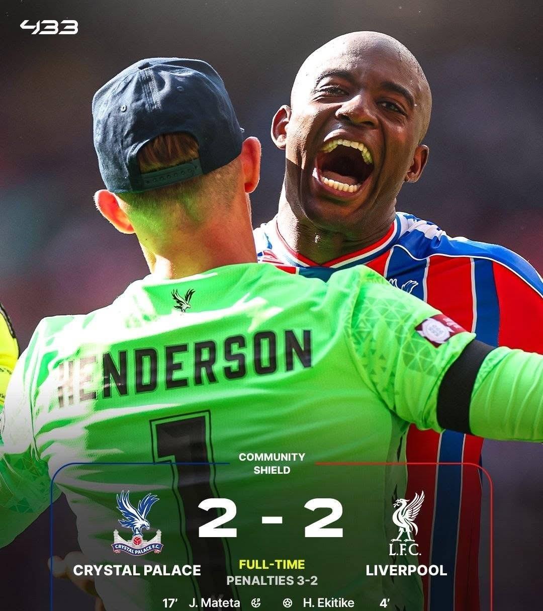 利物浦踢了一场假球,把一整个夏天的转会费都赚回来了,哈哈! 埃基蒂克开场的贴地斩技惊四座,弗林蓬的似传似射有点运气成分但绝对还是很精彩的,两位新援的表现都很出色。 维尔茨的分球和意识,真的是高级货。 全场被狂喷的加克波,没想到却罚进了点球。 下半场比赛,利物浦一点欲望也没有,最终被水晶宫扳平,然后在点球大战中输掉比赛,失去了社区盾冠军。 当然,都知道,赢得社区盾冠军会失去英超冠军,这是一个魔咒,或许这也是红军要输的原因?哈哈!
