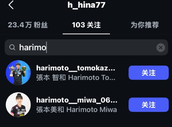 张本智和在社交媒体取消关注早田希娜,早田希娜仍在关注张本智和。