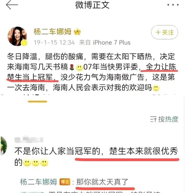 陈楚生不是靠实力当上07快男冠军的!07快男评委杨二车娜姆曾在社交平台公开说当年为了能让陈楚生当上冠军花了很大力气,并嘲笑支持陈楚生的网友“那你就太天真了!” 杨二车娜姆是个非常搞笑又大胆的人,记得张杰和谢娜的恋情也是她曝光的,当时张杰唱完歌她突然来了一句“这首歌是唱给谢娜听的”,后来她还点评张杰能成功是因为和谢娜“水乳交融”。 现在谁还敢这么说?