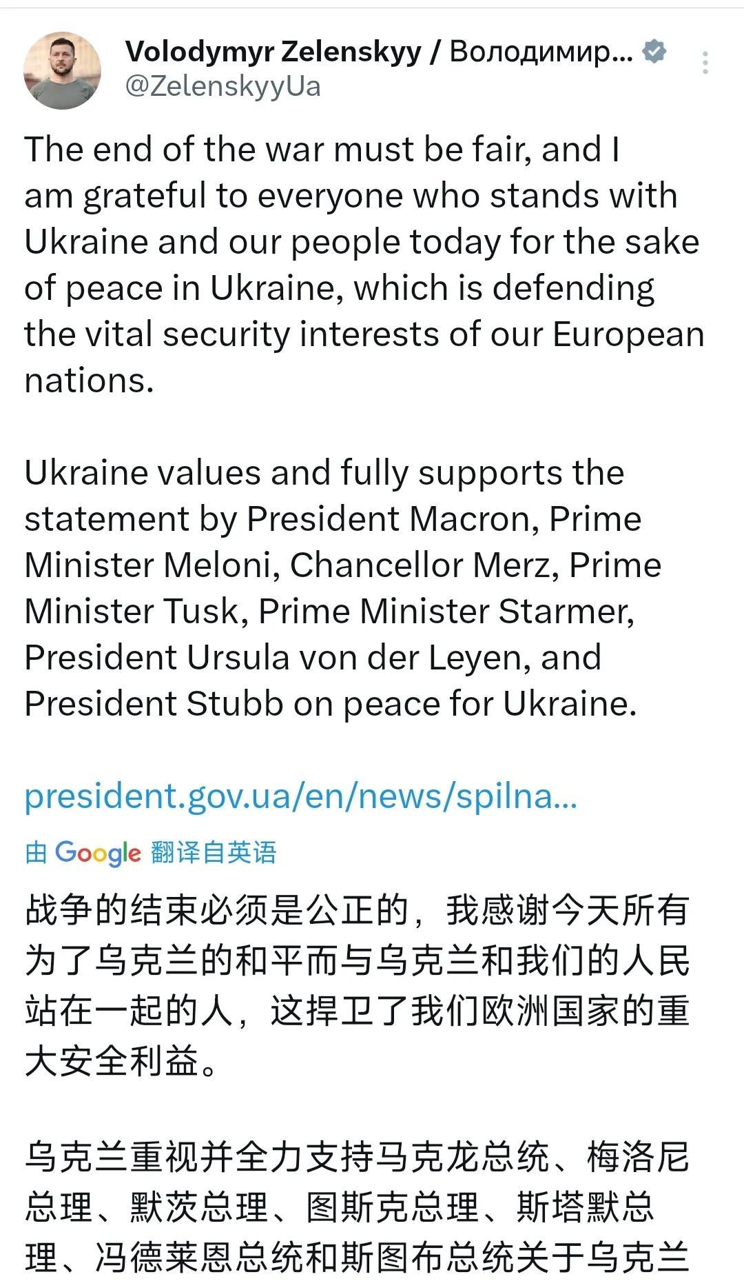 乌克兰总统泽连斯基今天(北京时间8月10日)写道:“战争的结束必须是公平的,我感谢今天为了乌克兰的和平与乌克兰和我国人民站在一起的每一个人,乌克兰正在捍卫我们欧洲国家的重大安全利益。乌克兰重视并完全支持马克龙总统、梅洛尼总理、默茨总理、图斯克总理、斯塔默首相、乌尔苏拉·冯德莱恩主席和斯图布总统关于乌克兰和平的声明。”