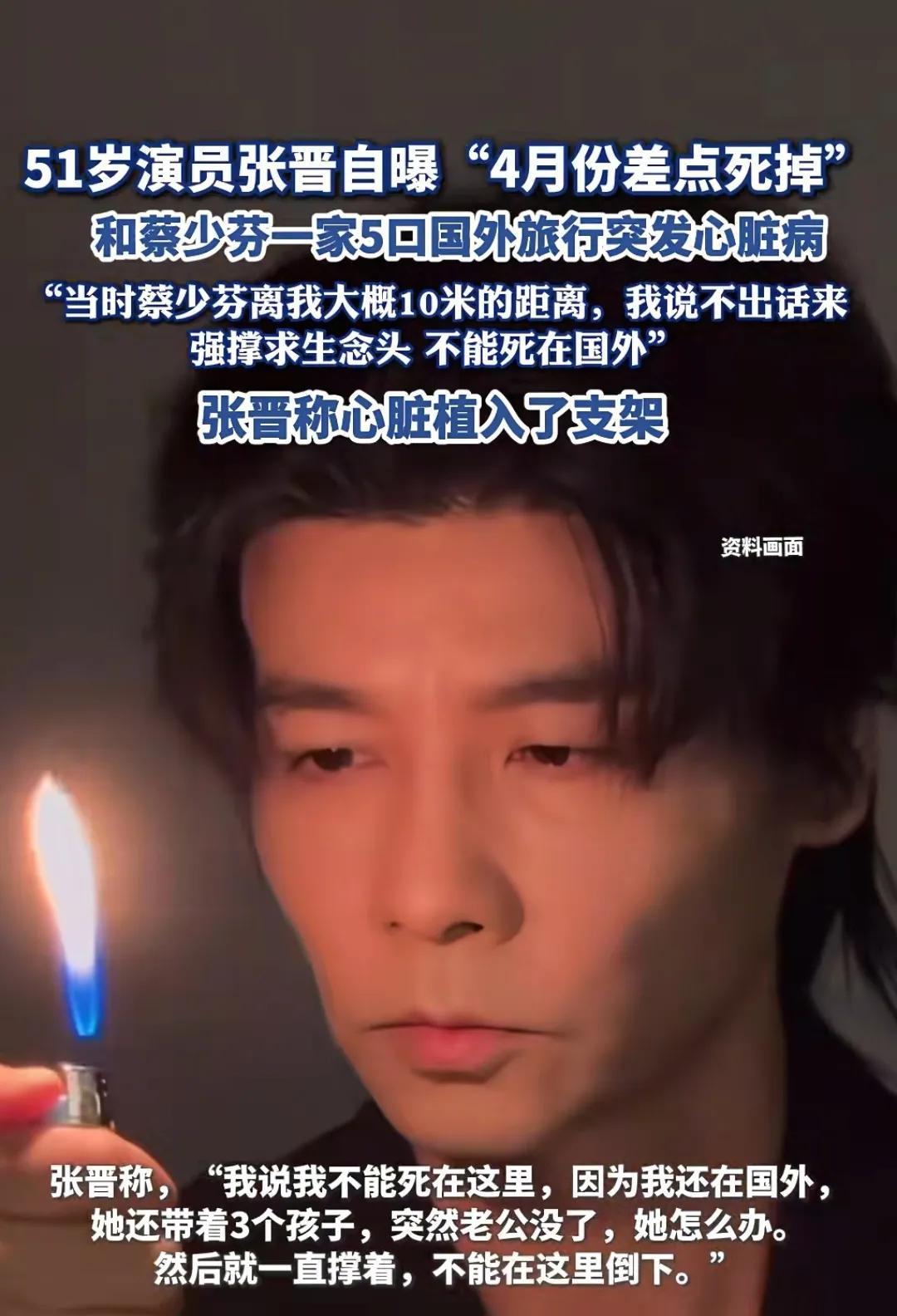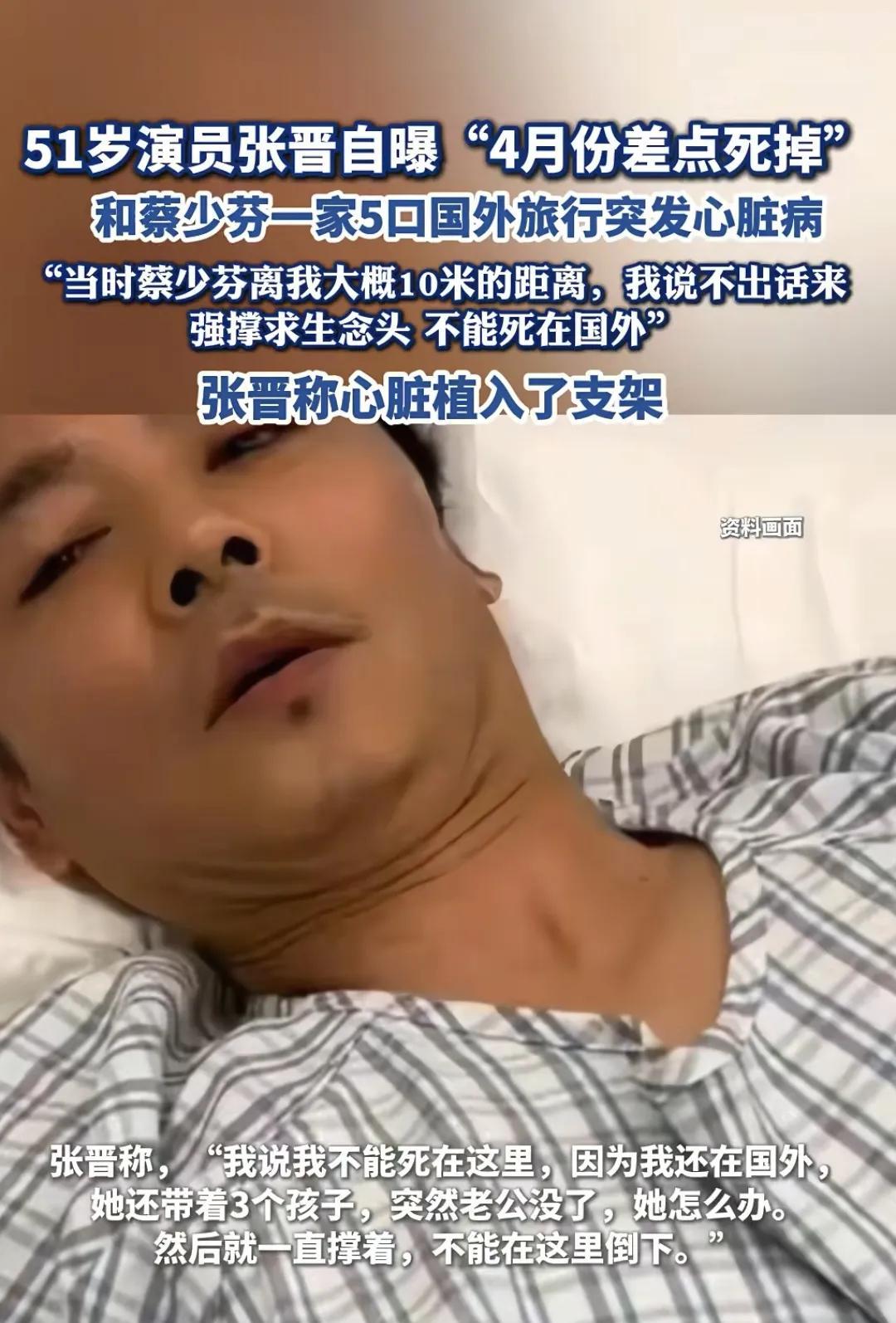 51岁的张晋说,自己4月份的时候差点死掉,就连张晋这样的身体,都差点因为心脏问题挂掉,那我们普通人更要多注意了。 张晋说4月份他和老婆蔡少芬带孩子们一起国外旅游,结果自己突发心脏病,呼吸困难,浑身冒汗,那时候妻子就离着自己大概10米的距离,但是我却说不出话来,当时真的害怕极了,就想,我不能死在国外,如果我没了,老婆一个人带三个孩子怎么办呢,幸亏撑下来了。 后来,回到香港,医生说,他当时可能就要死在那里了,真的很危险。 很多人说,以前看张晋身体很好,又是会武术的,以为他比其他的人要健康很多,谁知道他竟然有心脏病,还早早的做上了心脏支架,看来天天运动也不行啊,其实适当的运动可以,但是过度的运动说不定还会损害身体呢,这样想想,懒人也是不错的。
